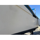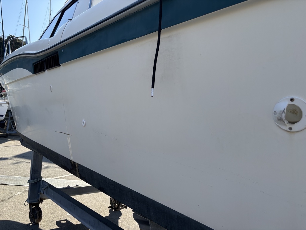 全体をぐるっと見渡すと、左舷側の線キズや使用に伴う小傷などはございますが、航行に支障をきたすようなFRPの大きな割れや、構造的な致命的ダメージは見当たりません。