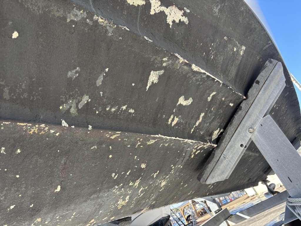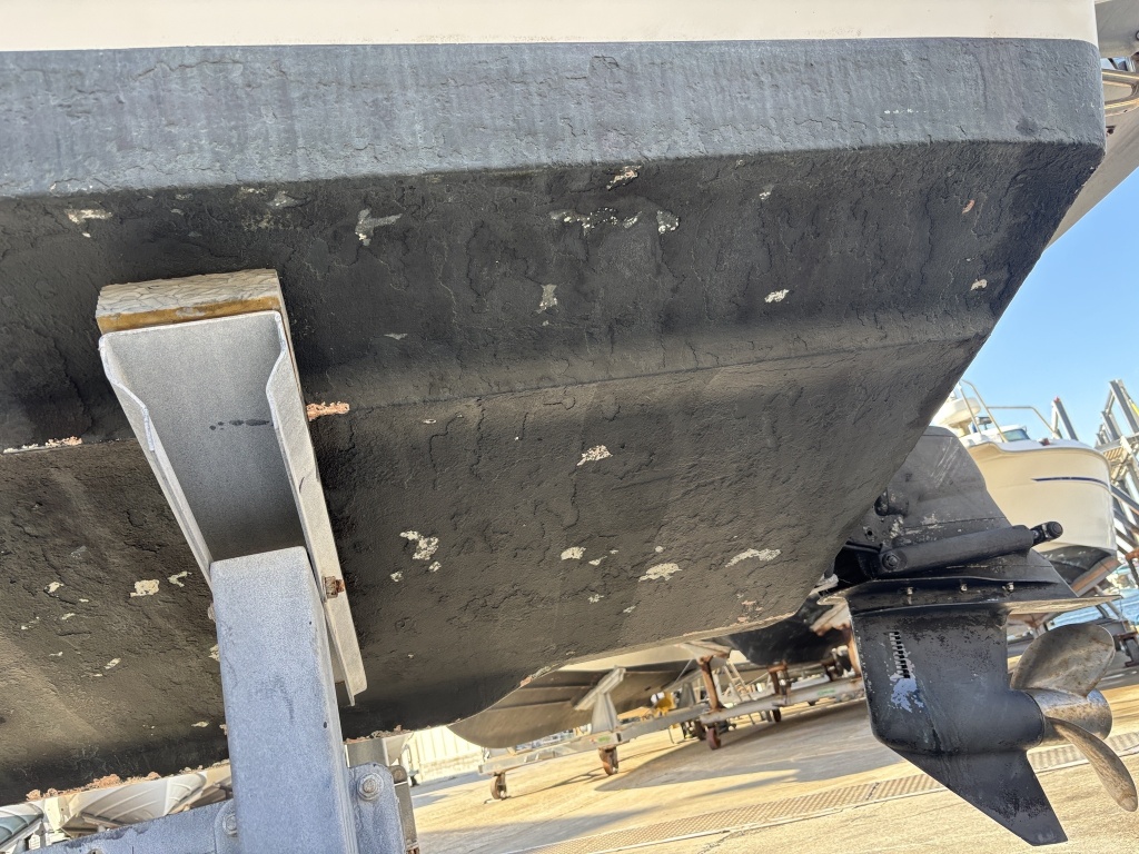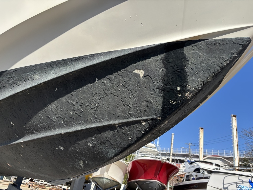 現状、船底には船底塗料の重ね塗りによる凸凹や一部剥がれがございます。あくまで外観からの目視レベルでの確認となりますが、FRP(船体)そのものに影響を及ぼすような深刻なダメージは見当たりませんでした。