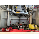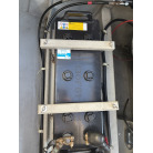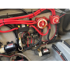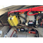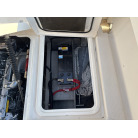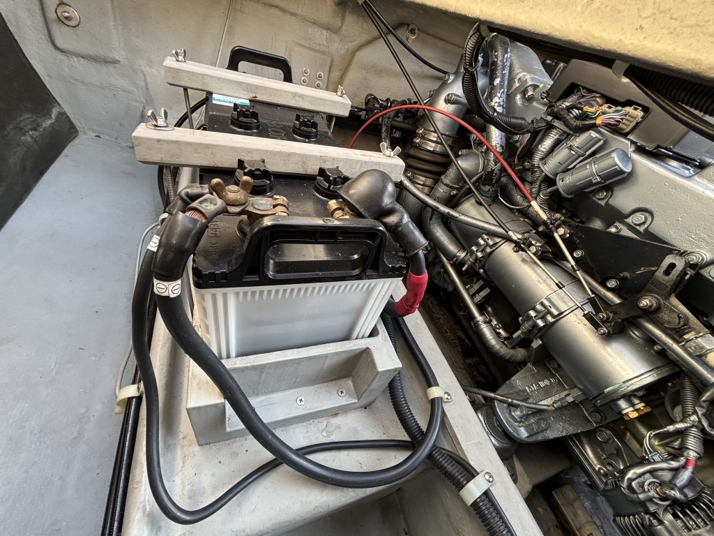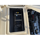 エンジンルーム壁面には、大型バッテリーのほか、BLUE SEA SYSTEMS製のバッテリスイッチ(エンジン・インバーター独立)や自動充電リレー(SI-ACR)がスッキリと配線されており、電装系の管理もしっかり行われていることが伺えます。