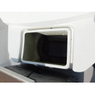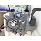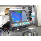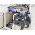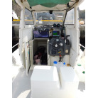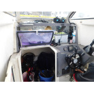 操船席はシンプルな作りで視界はよさそうです。操船席周りやパネル周りは物があふれていますが、片付ければきれいな状態です。HONDEXのGPS魚探HE-8Sが設置されています。