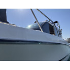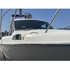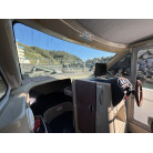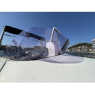 操船席およびナビシート(助手席)の上部には、日よけとなる黒いオーニングが展開されています。
