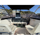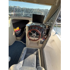 右舷前方に配置されたロアーステーション(メイン操船席)は、フロントウィンドウからの視界が広く確保されており、ウッド調の計器パネルとウッドステアリングが上質なクルーザーの雰囲気を演出しています。