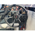 右舷側前方の操船席には、高級感のあるウッドステアリングが備わっています。