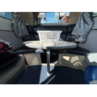 中央にはテーブルと対面で座れる独立タイプのゲストシート(青と白のツートンカラー)が備わっており、ゲストと向き合って食事や歓談を楽しめるレイアウトです。