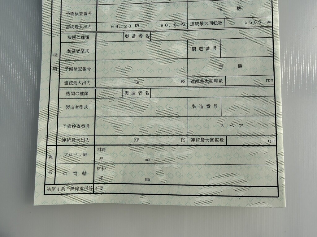 | 船検証記載馬力 | 90馬力 / 5,500rpm(回転数) | 推進機器種類 | 船外機 |