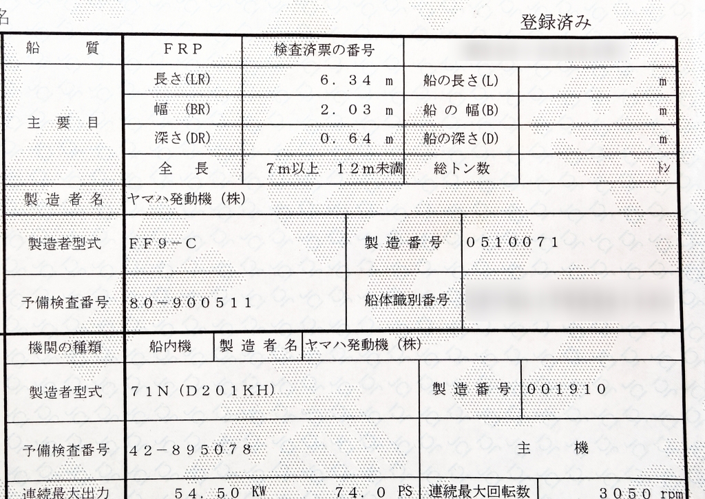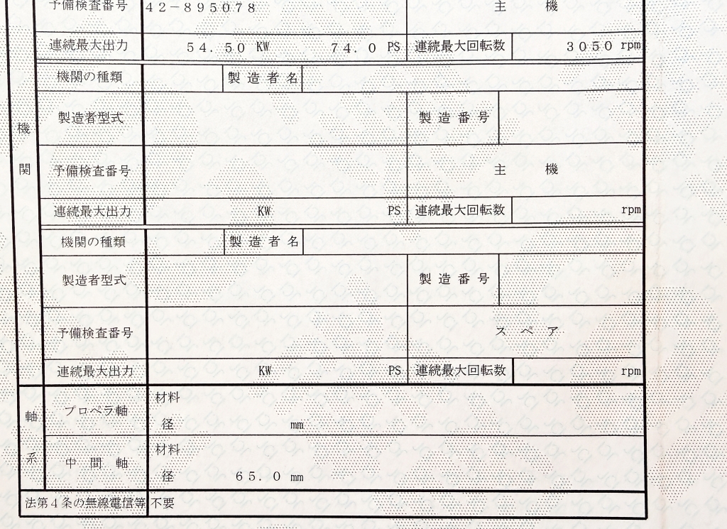 | 船検証記載馬力 | 74馬力 / 3,050rpm(回転数) | 推進機器種類 | ドライブ艇 |