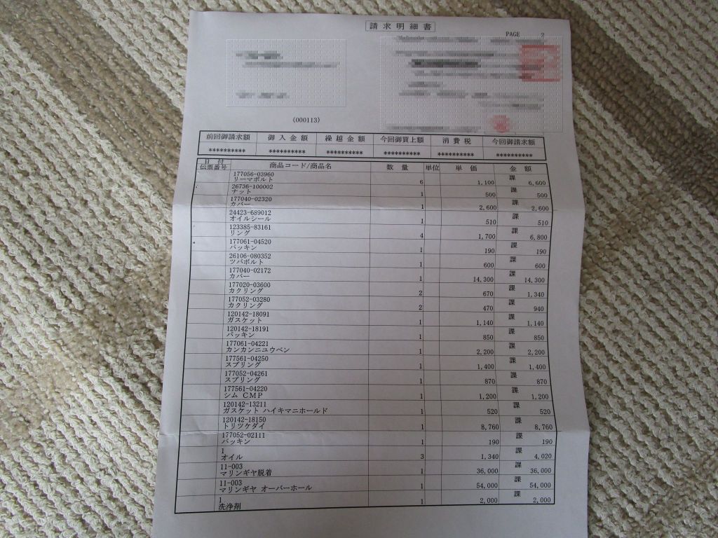 ・マリンギャー(クラッチ板交換、及び各種シール、バルブ類、オイルクーラー交換、オイル交換)