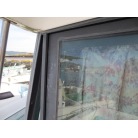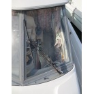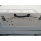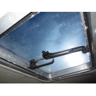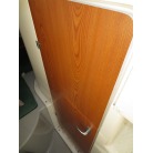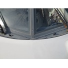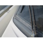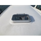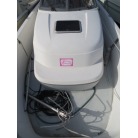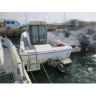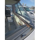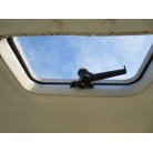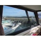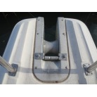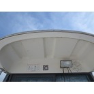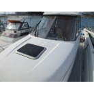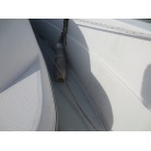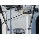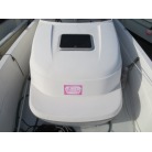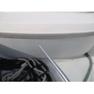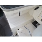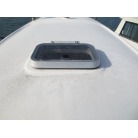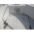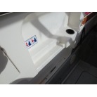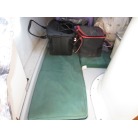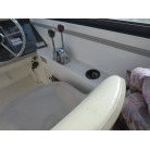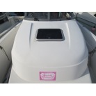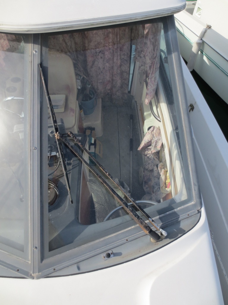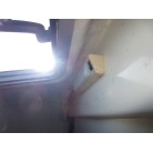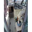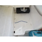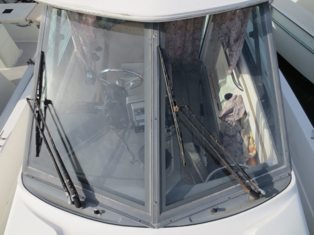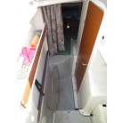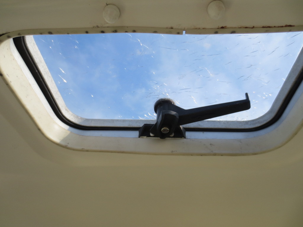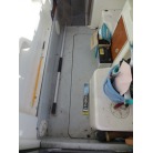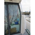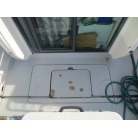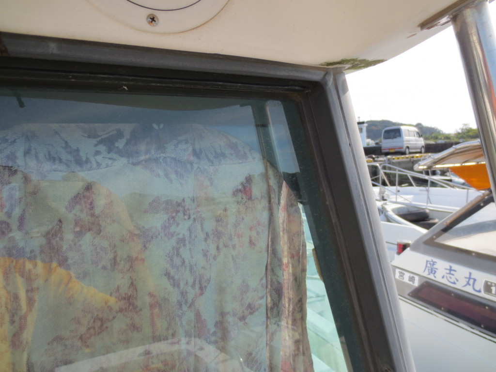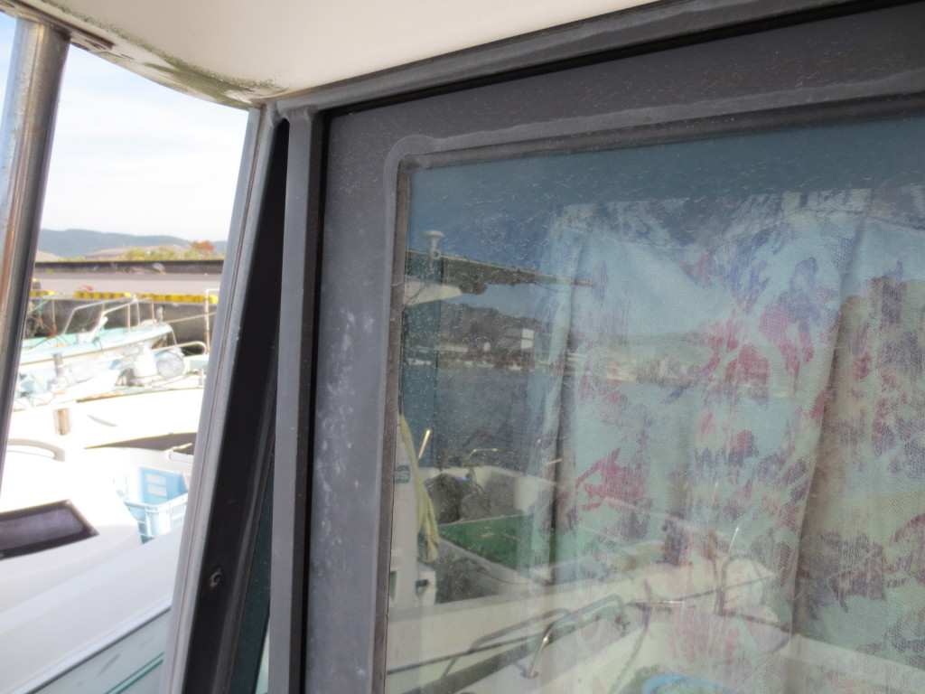室内はメーカ純正の施錠のできるリアドアを開けて入ります。釣り道具などが散乱していますが操船席後ろにも一人分のシートがあり、スカイハッチも装備しています。壁などを見たところ雨漏り等は無いような感じです。