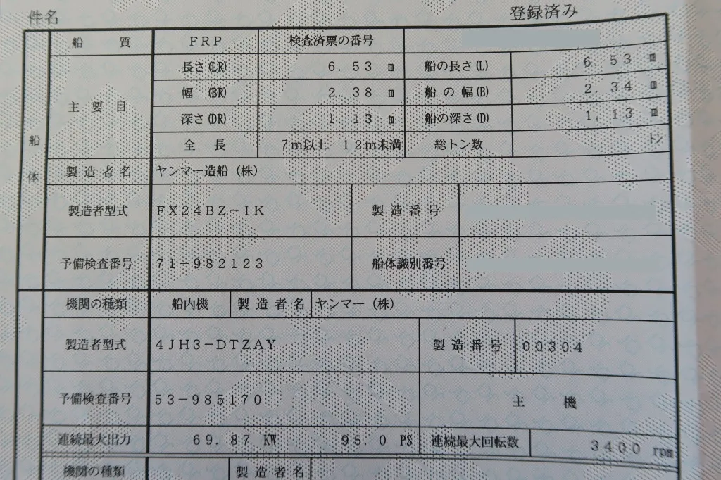 | サイズ(船検証) | 全長:6.53m 全幅:2.38m 全深:1.13m | ||