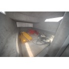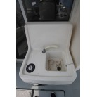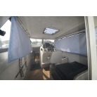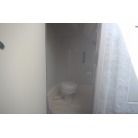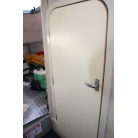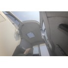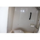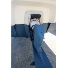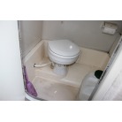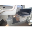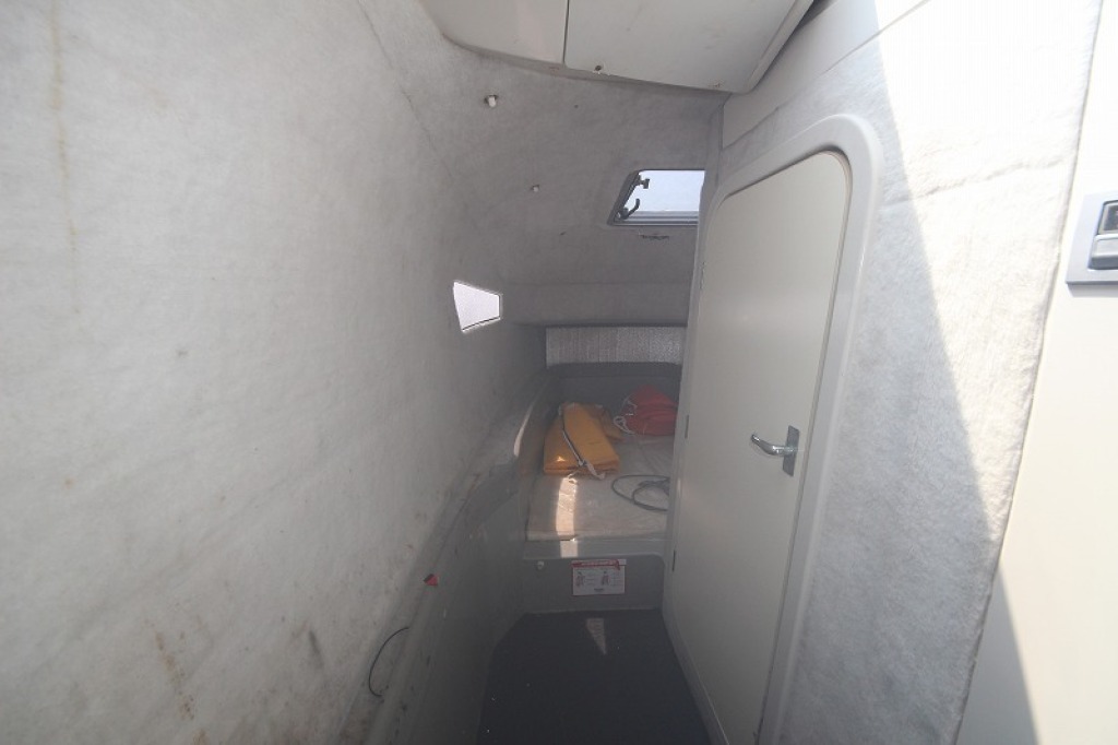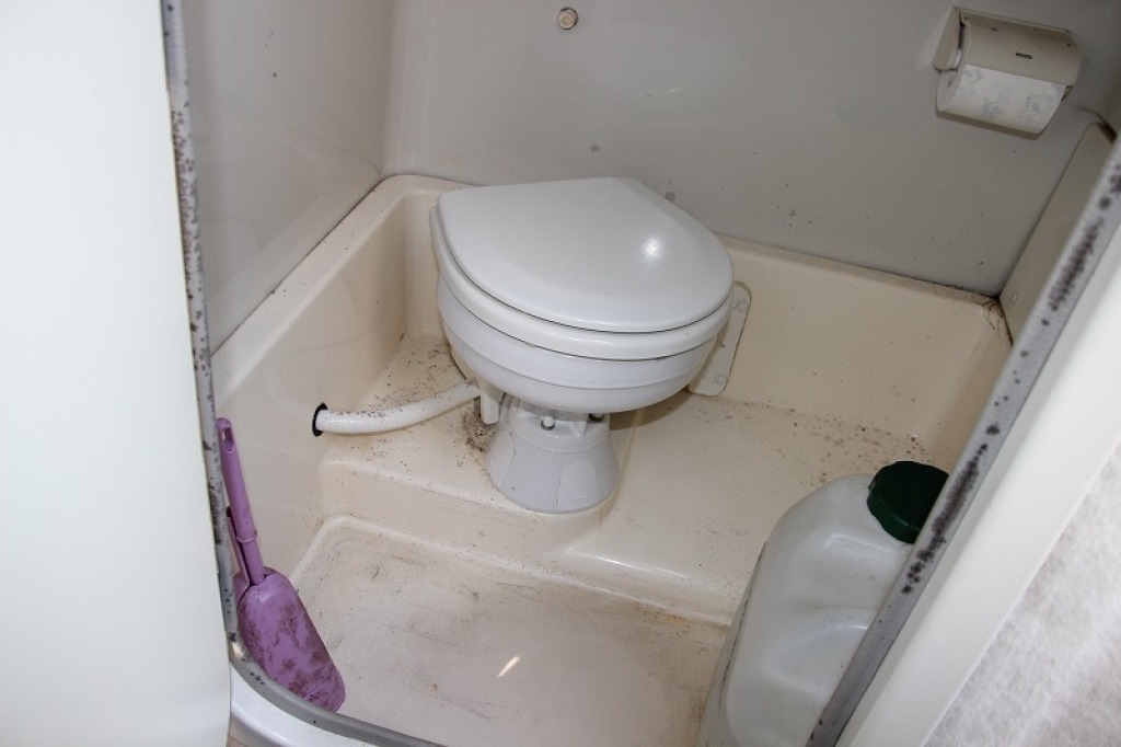 操舵席の左横にはキャビンへ通じる階段があり、降りると横になれるスペースとマリントイレが設置された空間になっています。