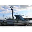 また、操船席はアフトデッキにあるため、ハードトップから木製の日除けが設置されていました。