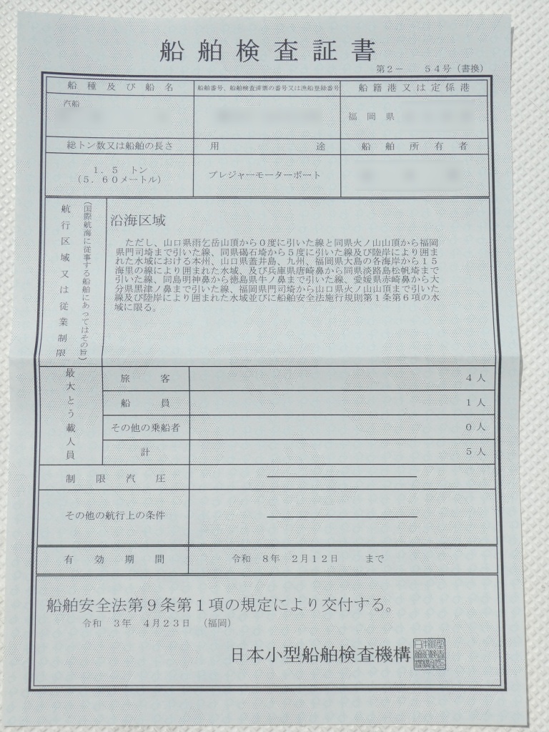| 定員 | 5人 | 次回船検 | 中間検査(2023年05月12日) |