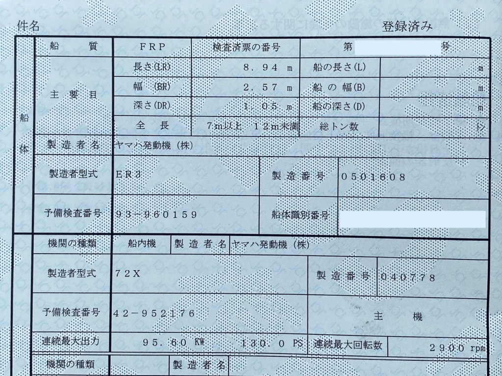 | 船検証記載馬力 | 130馬力 / 2,900rpm(回転数) | 推進機器種類 | ドライブ艇 |