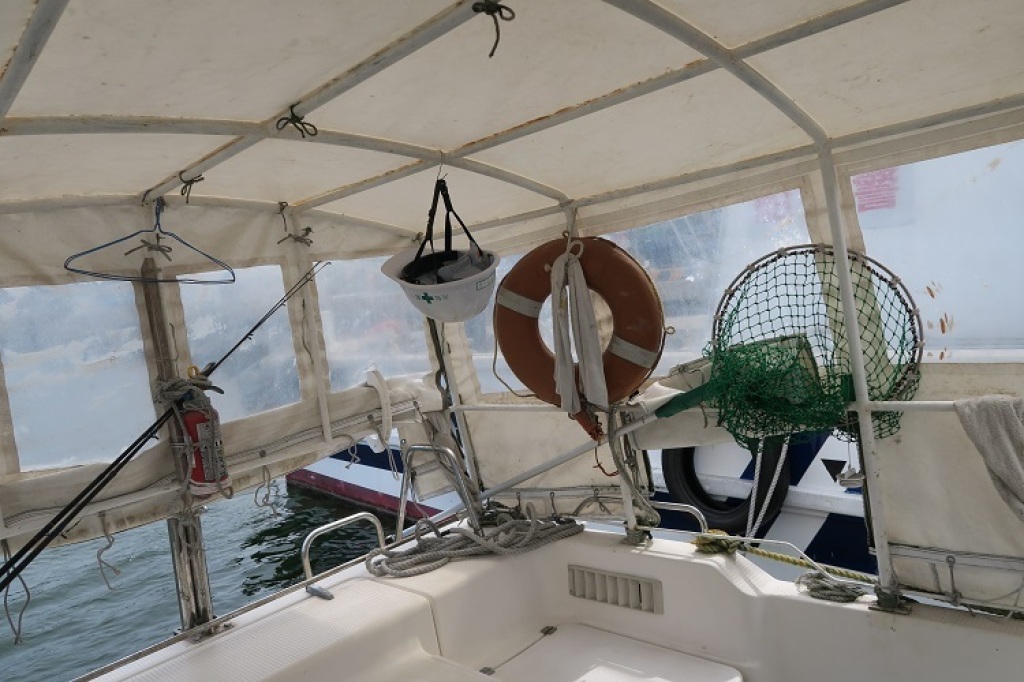 ウォークアラウンドの艇で手頃なサイズです。交通兼作業船として使用していた為、アフトデッキには大型のオーニングが設置されています。