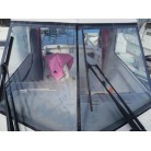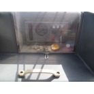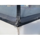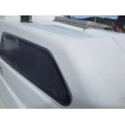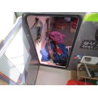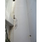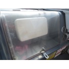 室内は施錠のできる純正ドアが備わり、道具の保管や休憩にお使いいただけると思います。アクリル製のサイドウインドーに経年劣化からのヘアクラックが見られますが、割れもなく防水が保たれているようです。