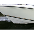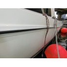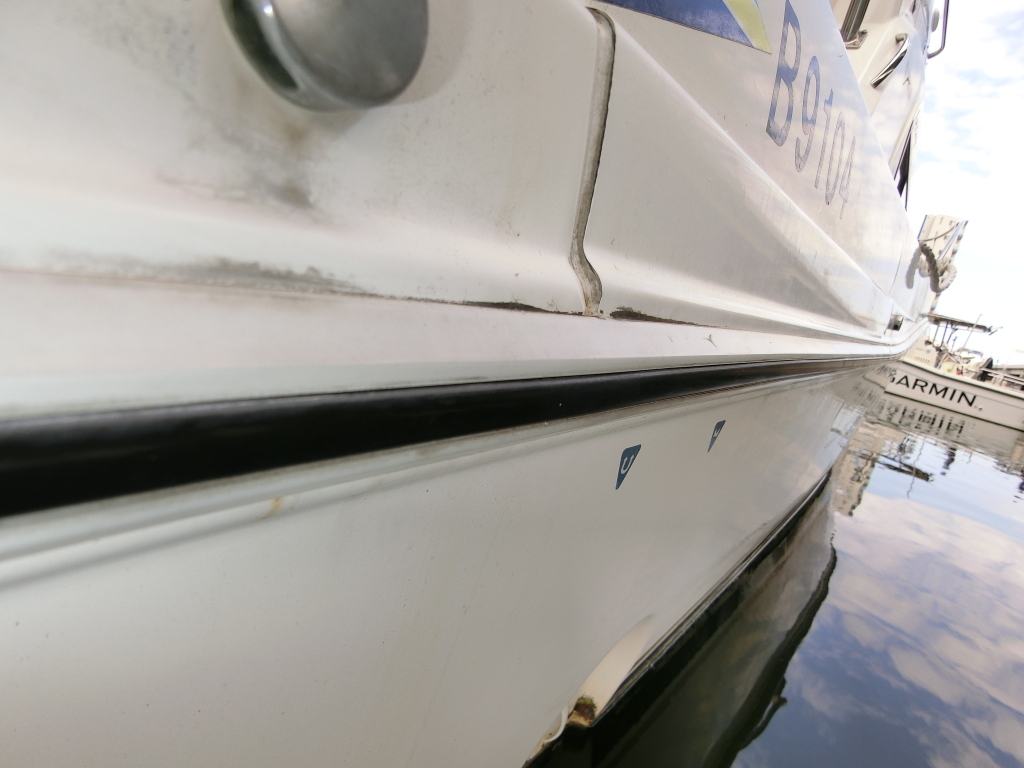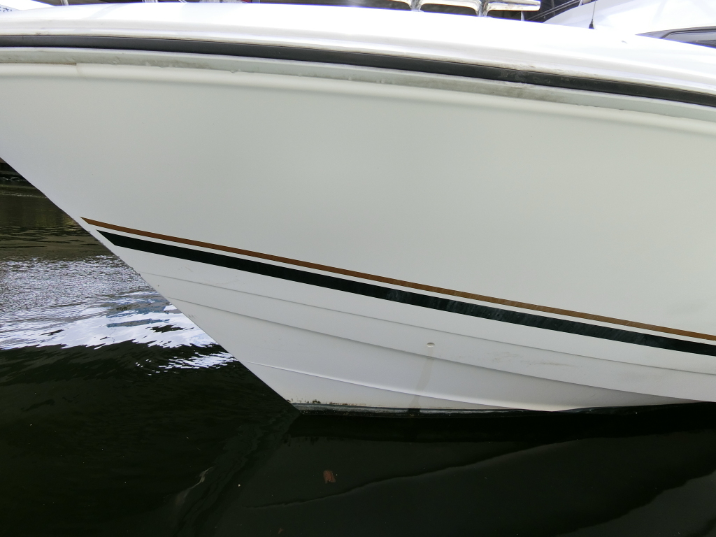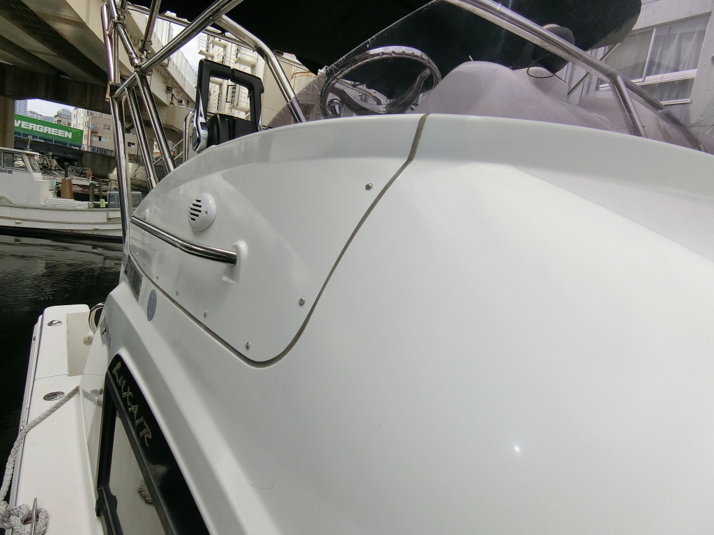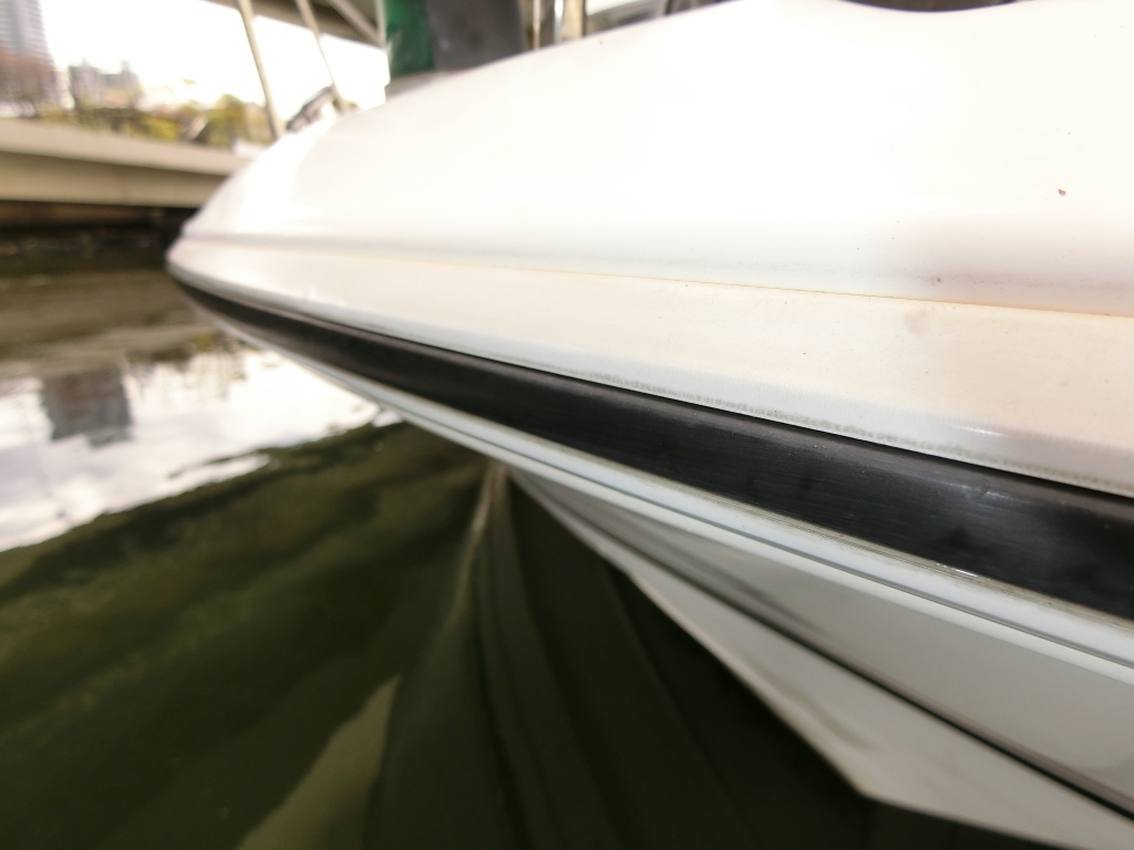 ハル周りは年式相応の使用感と小キズ・線キズ・汚れが見られますが、係留状態で確認出来る限りでは、ハルの先端部分以外の大きなキズは見られません。