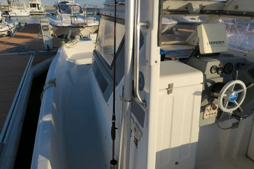 操船席周りは、計器類のほかはGPS魚探のみ設置されています。