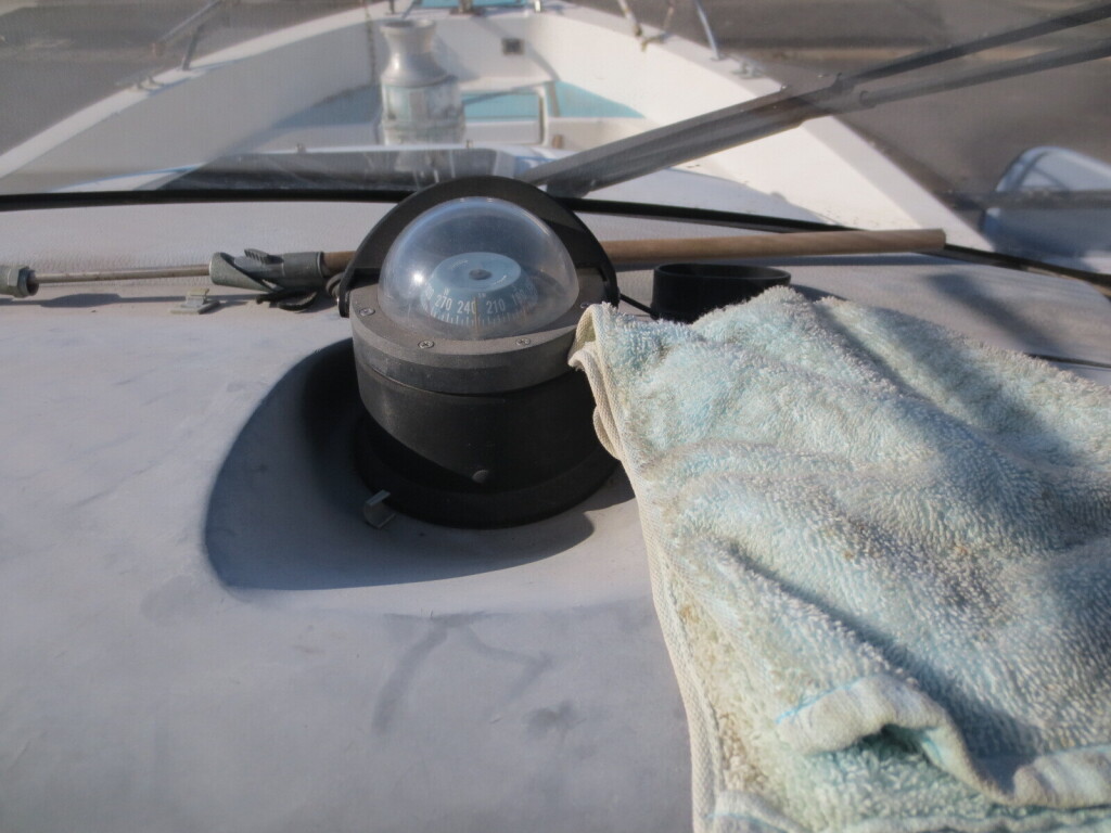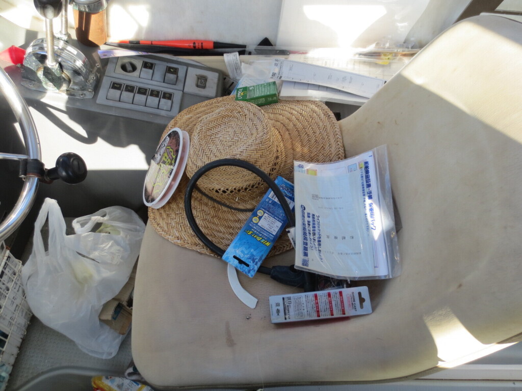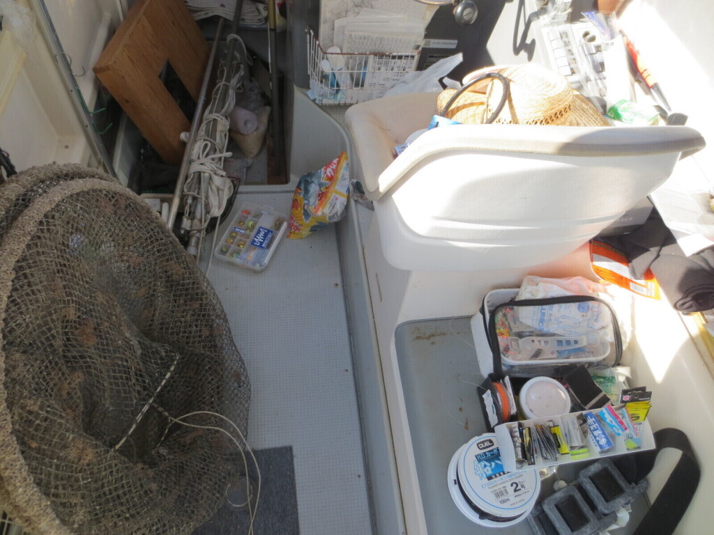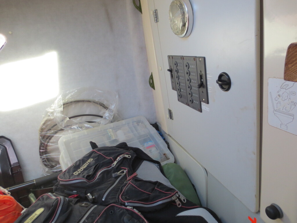 操船席周りは現在お乗り換え準備の為、GPS魚探を移設したりで荷物が散乱していますが、後日清掃し荷物を搬出予定です。操船席上にあるハッチは年始からすると状態は良く、水漏れや曇りも少なく風通しや夜間航行時に顔を出せるためとても便利な装備の一つです。
