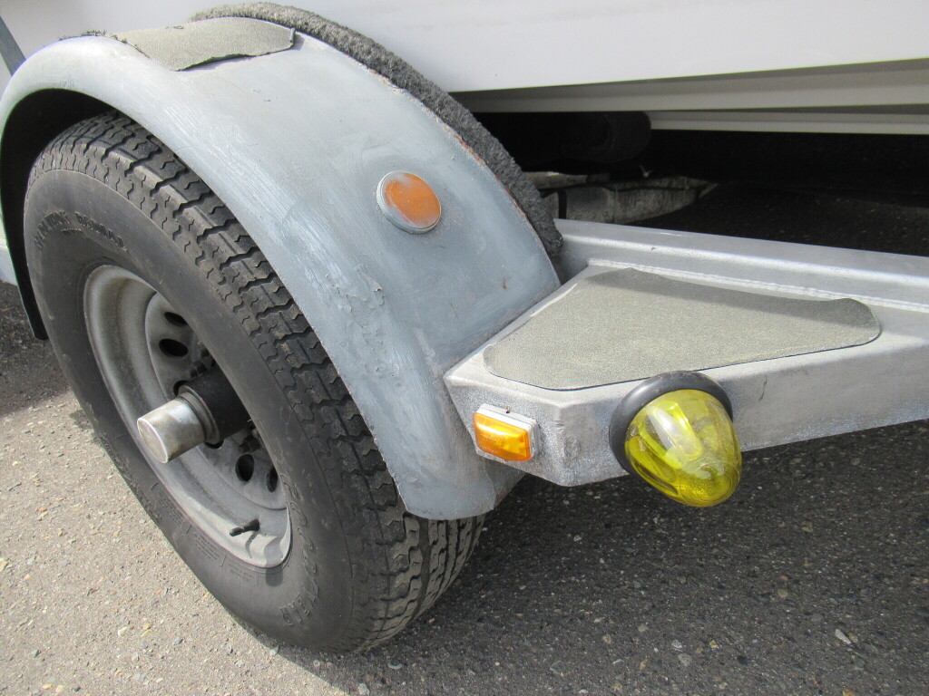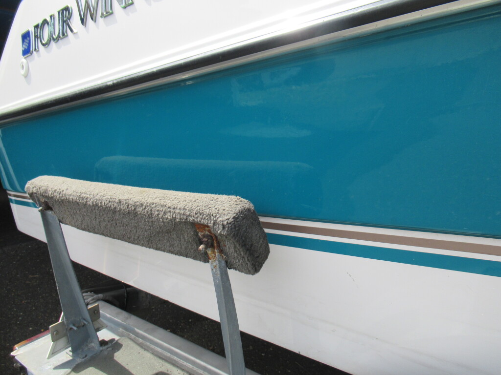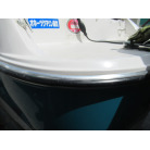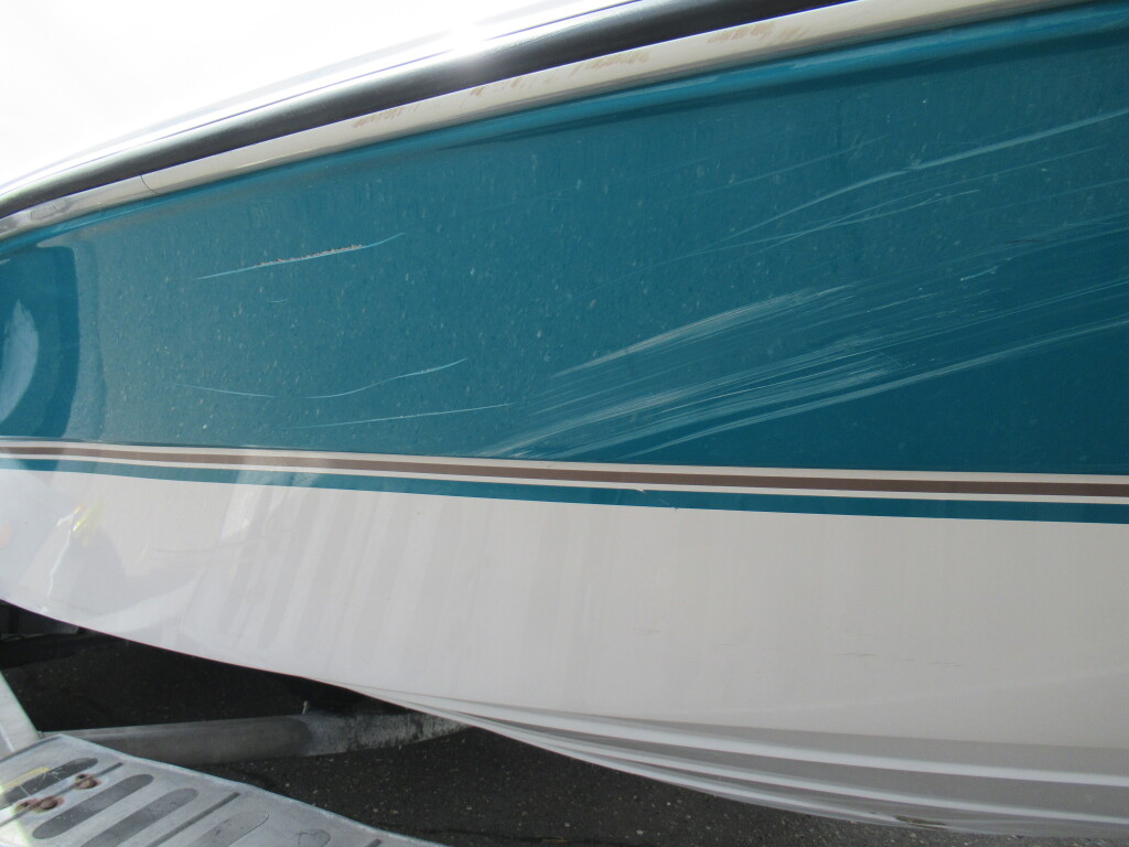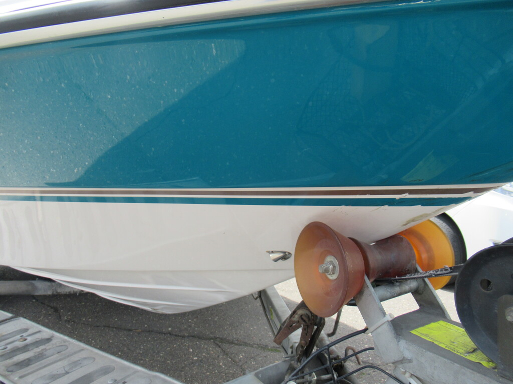ハル周りは、船首側トレーラのローラー部付近の傷や汚れ、左舷側には数箇所の傷、右舷側には小さくパテで補修した箇所があり目立つ傷が数箇所見られますが、屋内保管されているためか、年数経っていますが全体的にはつやがあり綺麗な印象でした。