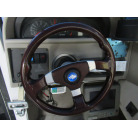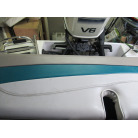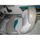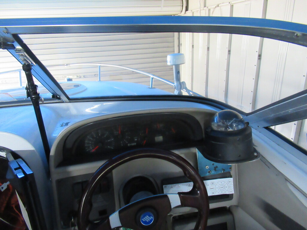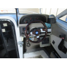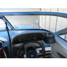 操船席周りは、カッコいい印象の木彫ハンドルやゲージ類が配置されています。操船席シートの状態は良好です。