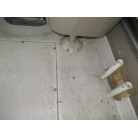 船首側の付着物は、砂浜乗揚げ等のため、船底保護に貼った船底ガードの剥がした残りとのことです。パテで補修した箇所ではありません。