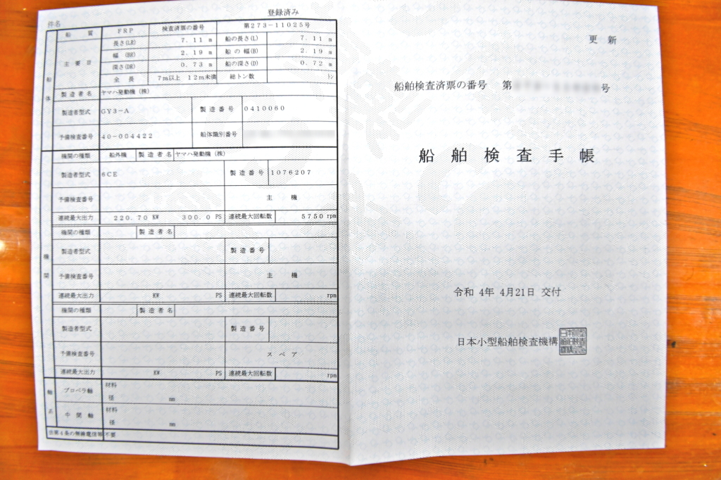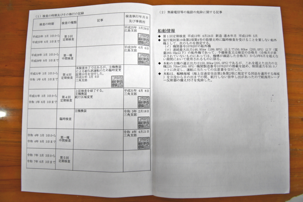 | 船検証記載馬力 | 300馬力 / 5,750rpm(回転数) | 推進機器種類 | 船外機 |