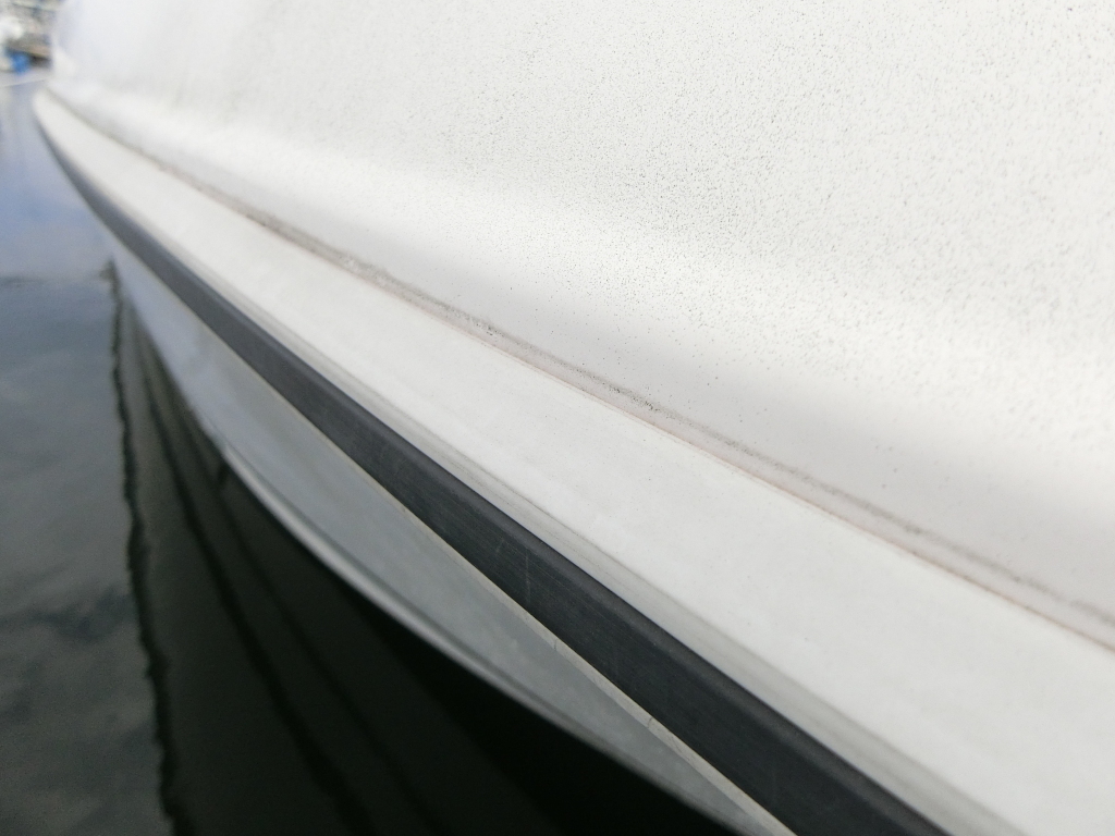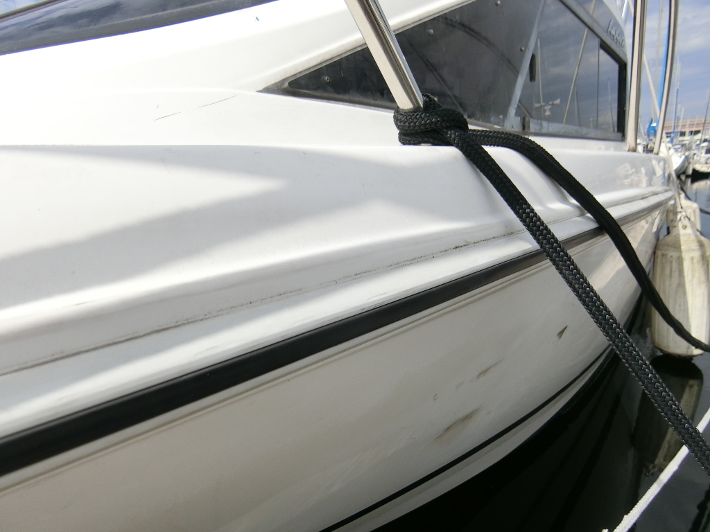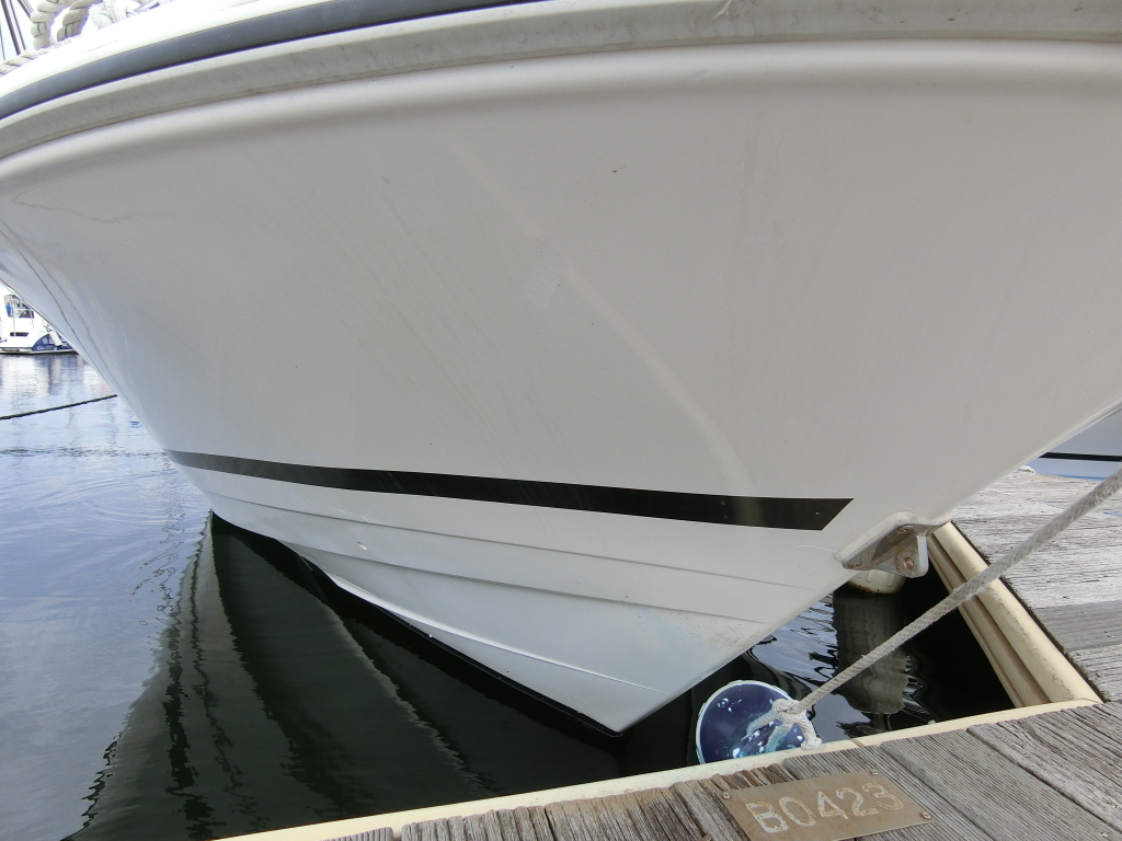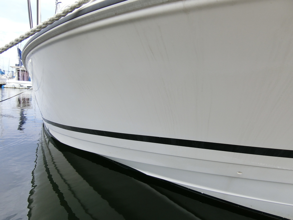 目に付くキズとして左舷側の比較的前の方のハルに着岸時に付いたと思われる複数の線キズと擦れが見られます。