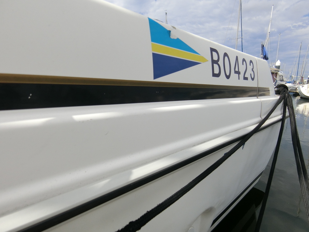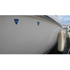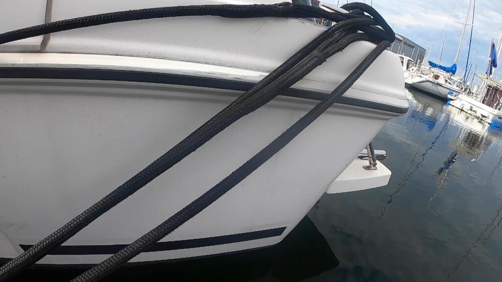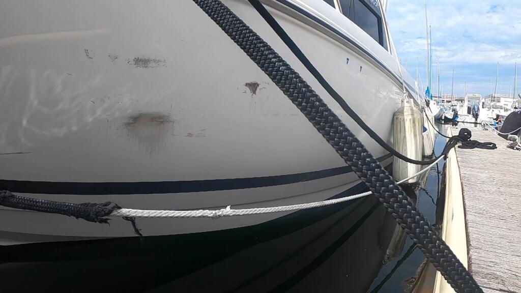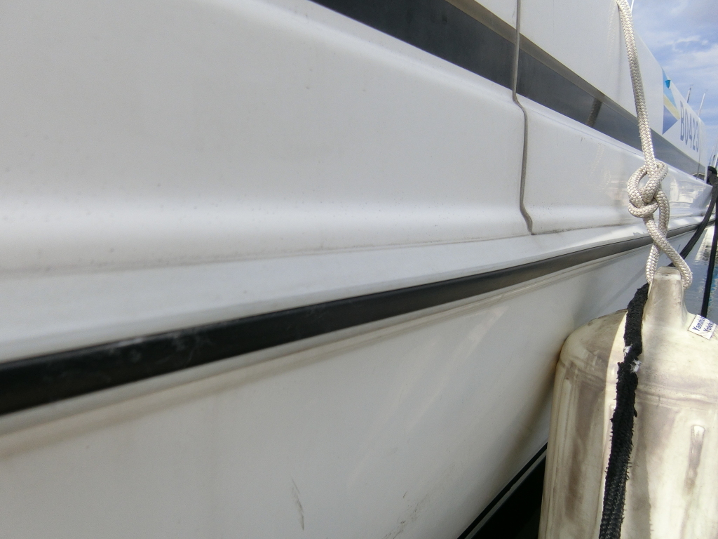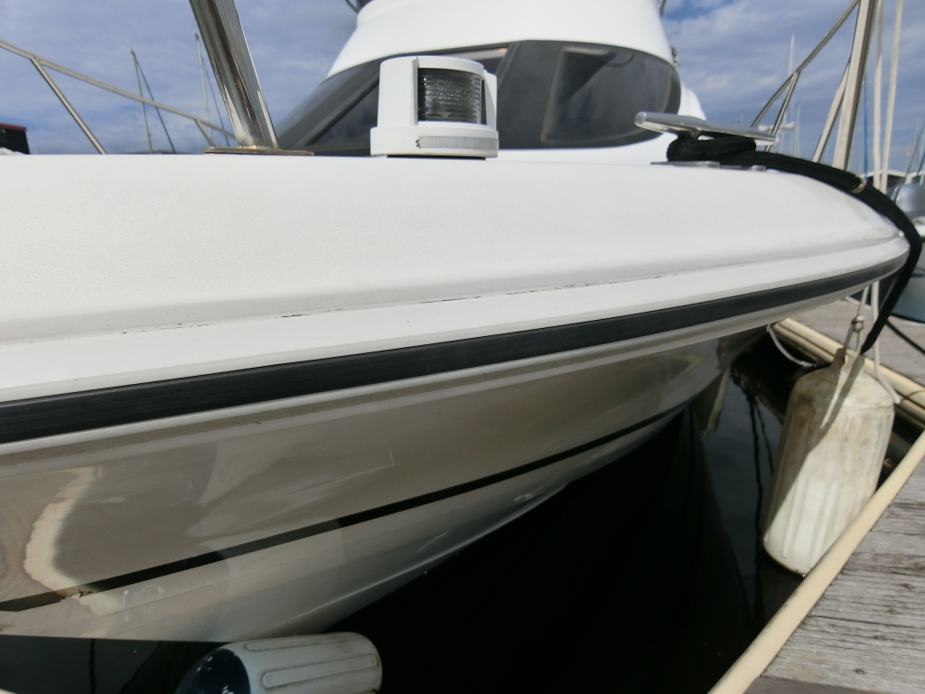 目に付くキズとして左舷側の比較的前の方のハルに着岸時に付いたと思われる複数の線キズと擦れが見られます。