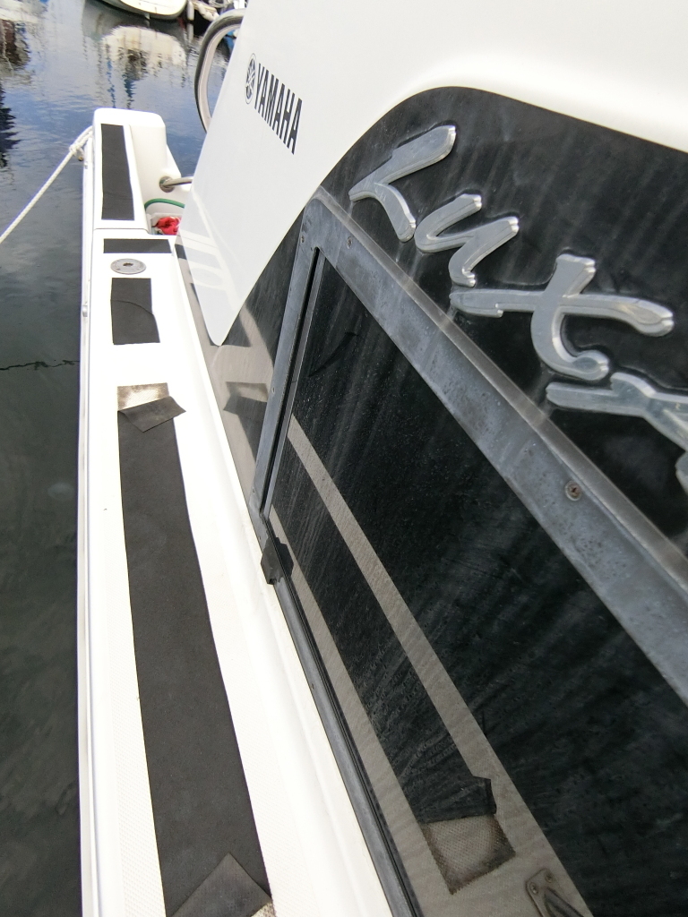 唯一気になったのが、左舷側後部のガンネルの上の部分(ベイサイドマリーナのステッカーが貼ってある部分)に目立つキズが見られました。
