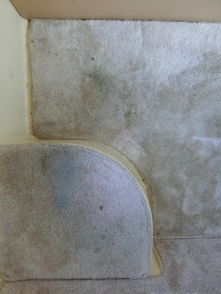 ②キャビン入口入ってすぐに絨毯部分に土足の跡と思われる青い汚れが付いています。
