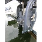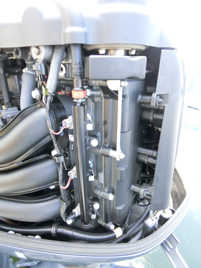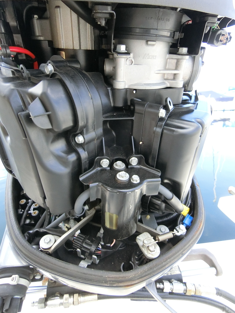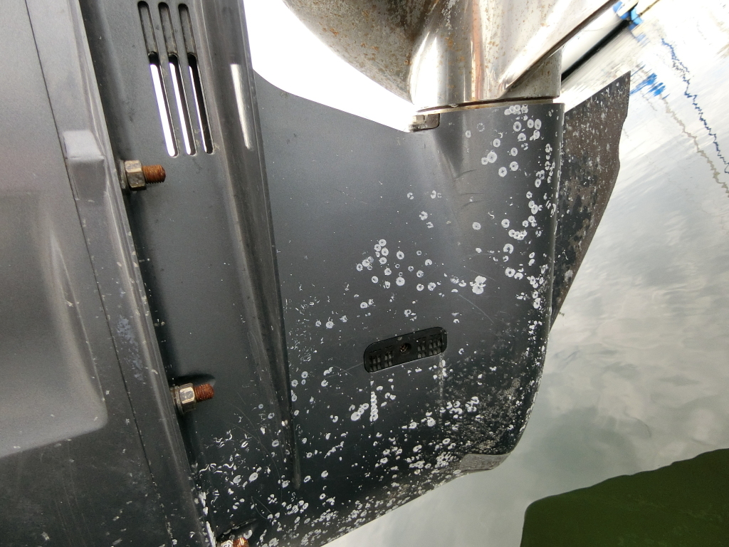 エンジンは外観もカバーを外した中も大変キレイなのですが、一度保管中にチルトが落ちてしまったことがあるそうで、ロアケース周りにフジツボの跡が付いており、そこの部分が少し見栄えを悪くしています。