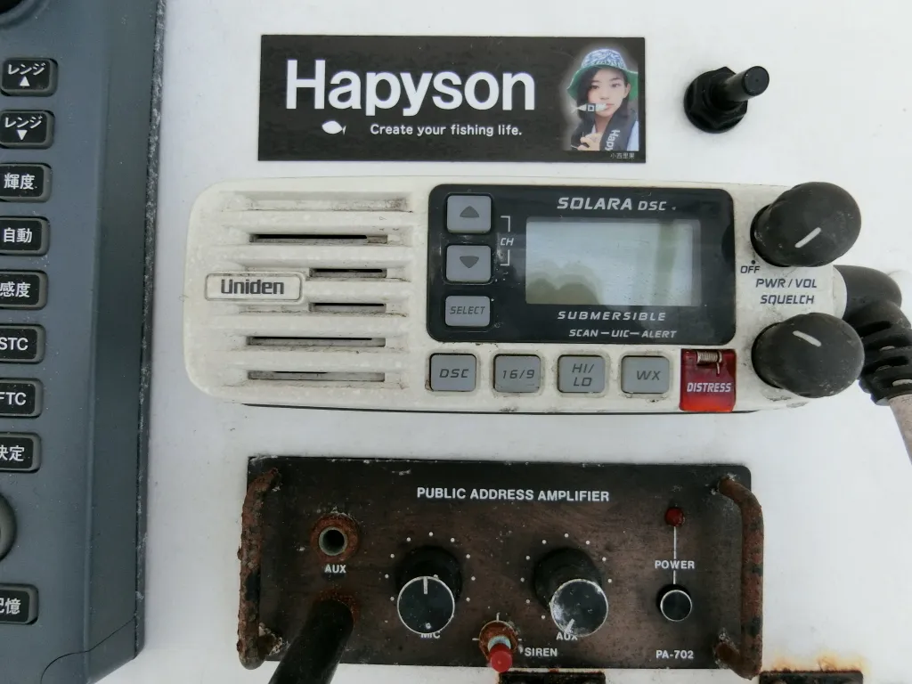 ・操船席の上部には左から「KODEN製GPS魚探」「FURUNO製魚探」「KODEN製マリンレーダー」「UNIDEN製無線機」が並びます。