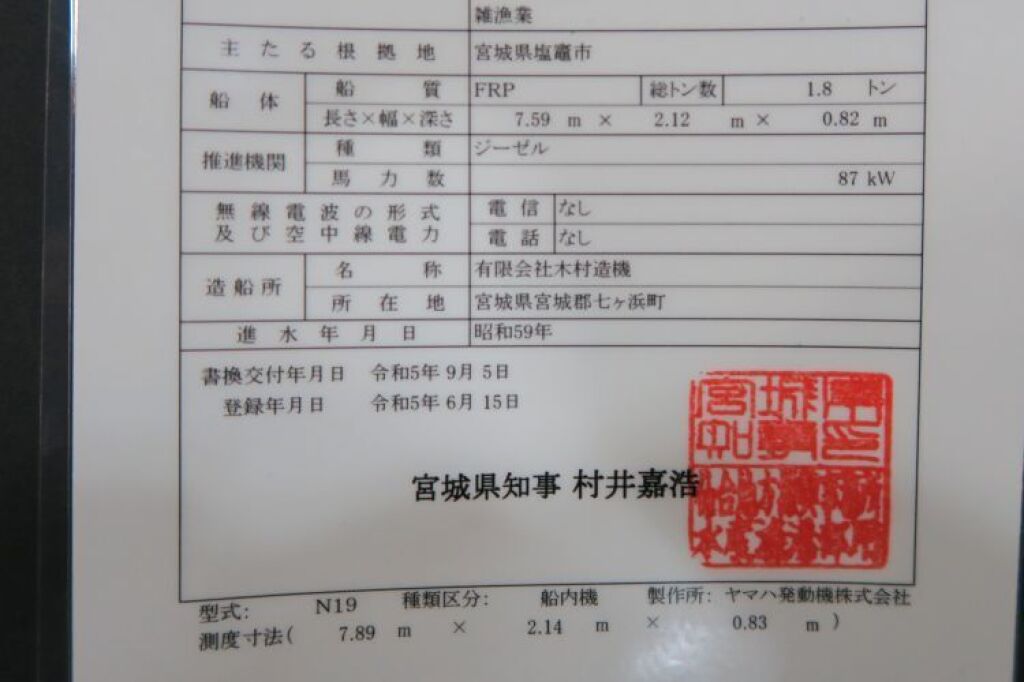 | サイズ(船検証) | 全長:7.59m 全幅:2.12m 全深:0.82m | ||