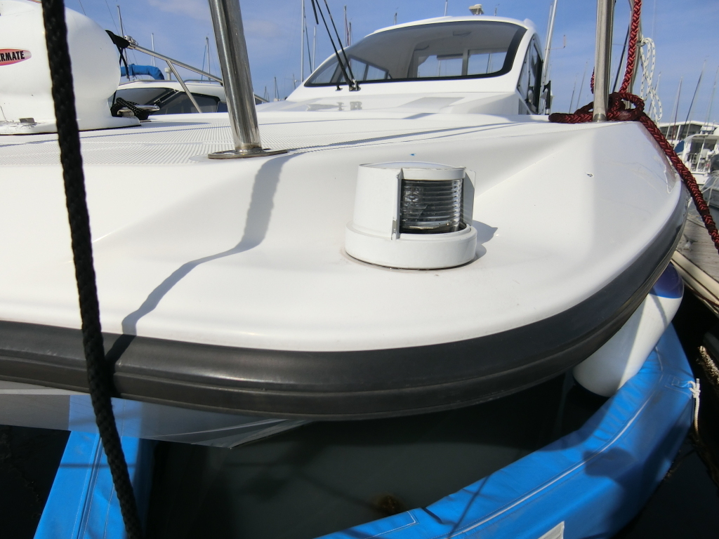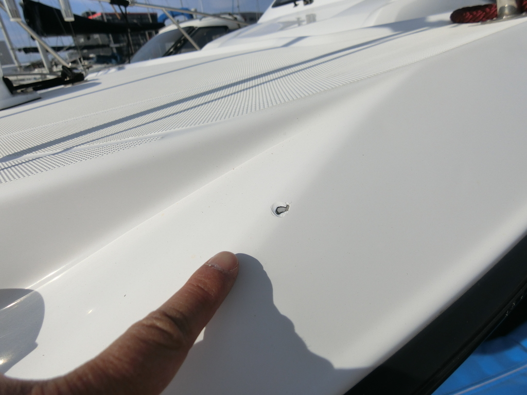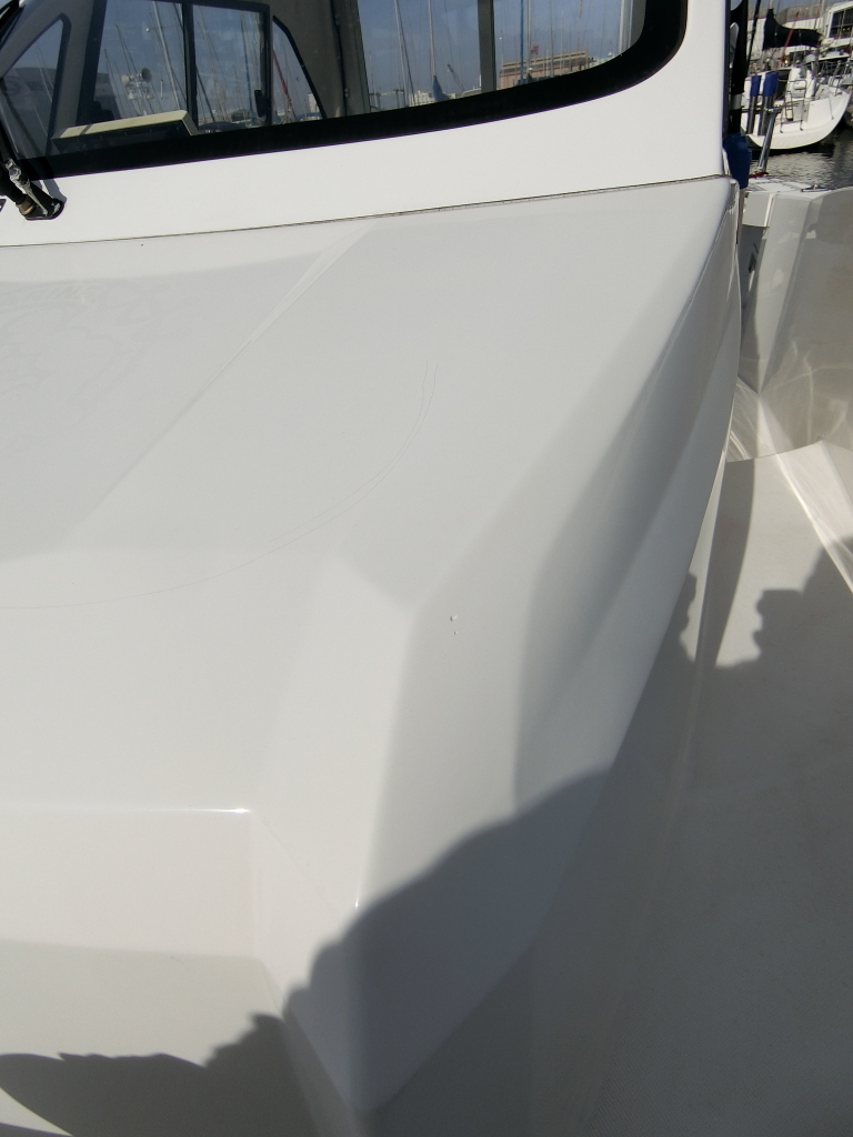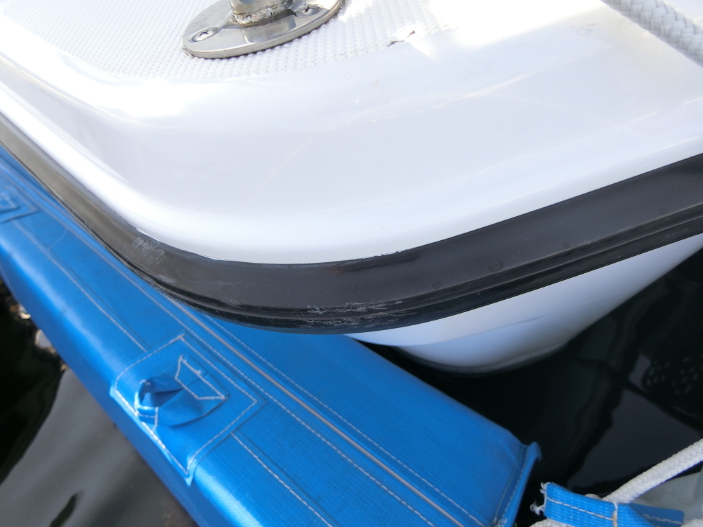 バウデッキ左側のガンネルの上辺りに、小さなFPRの欠けが見られます。