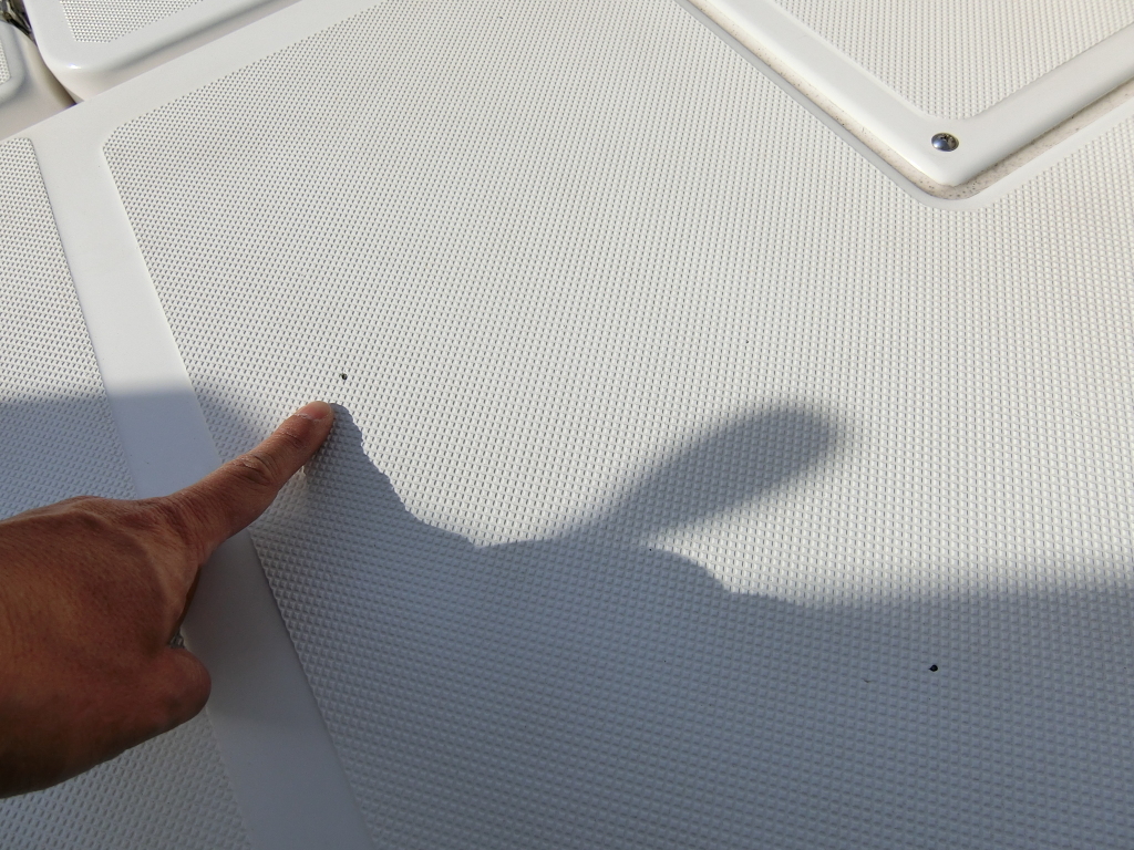 デッキ周りのFRPの状態も年式が新しいだけに良好だと思いますが、取材時に確認した限りでは、デッキ上に3カ所小さなFRPの欠けが見られました。(デッキ上に指を指している写真をご覧下さい。)