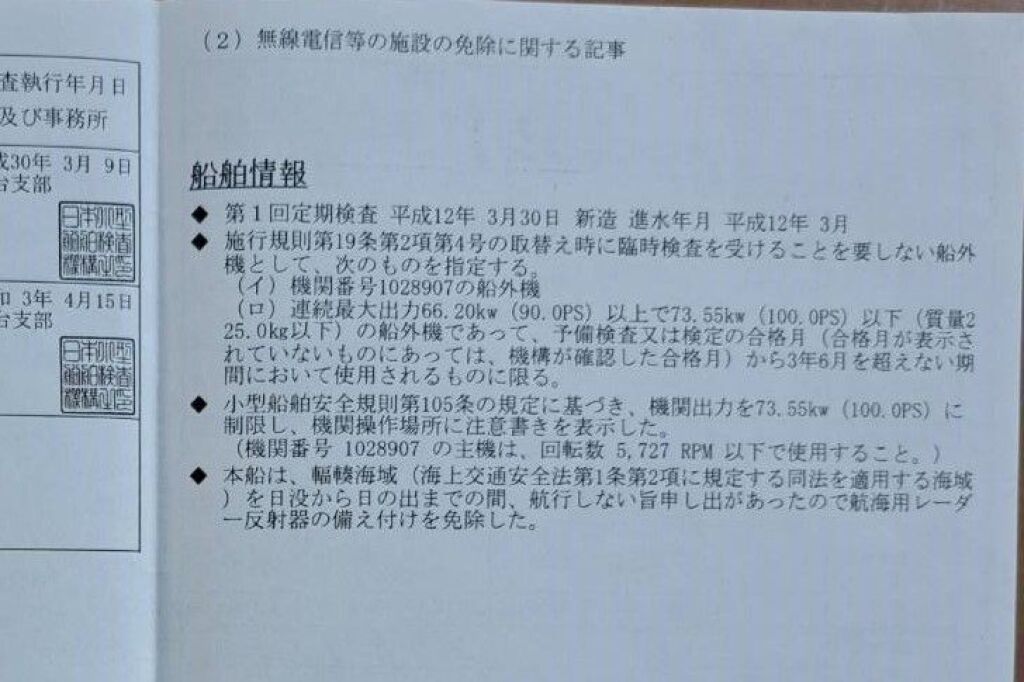 | 船検証記載馬力 | 115馬力 / 6,000rpm(回転数) | 推進機器種類 | 船外機 |