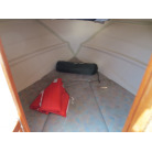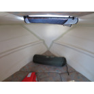キャビン前室の手前にはギャレースペースがあり、電子レンジが置かれています。カセットコンロなどの増設も可能な造りです。