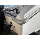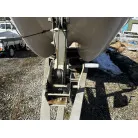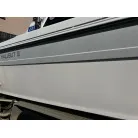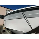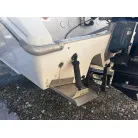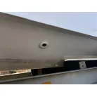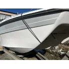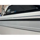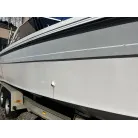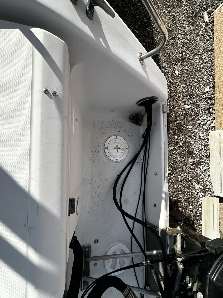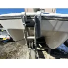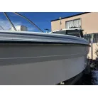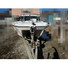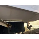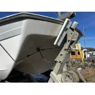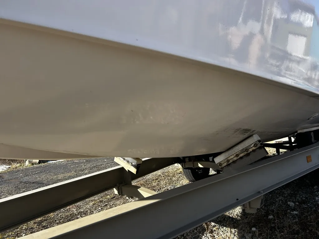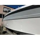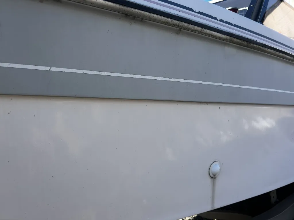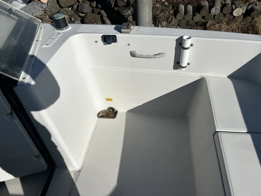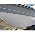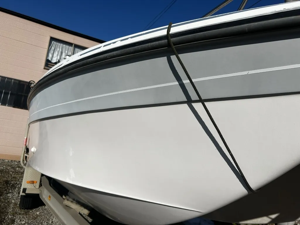 ハル回りの経過は、サイドのステッカーに一部剥がれや全体的に汚れがみられますが、クリーニングすれば比較的きれいな印象です。 左舷ガンネル付近には、FRP表面に一部欠けがあり、コーキングによる補修跡が確認できます。トランサムにはトリムタブが装備されており、走行時の姿勢制御に優れています。 大きな傷や損傷はなく、全体的に良好な状態を維持していると思われます。