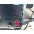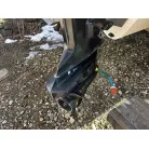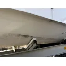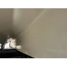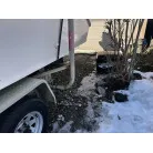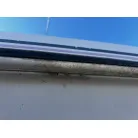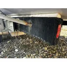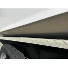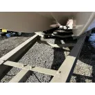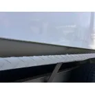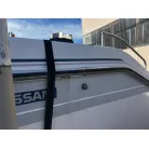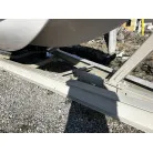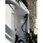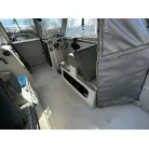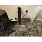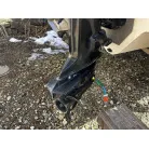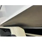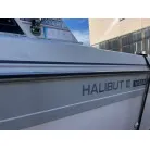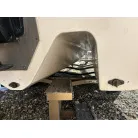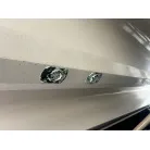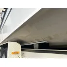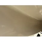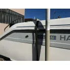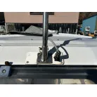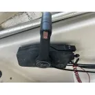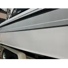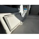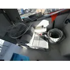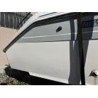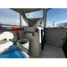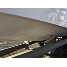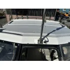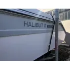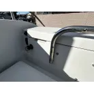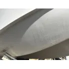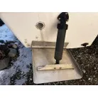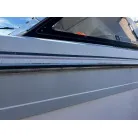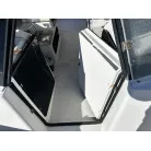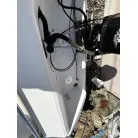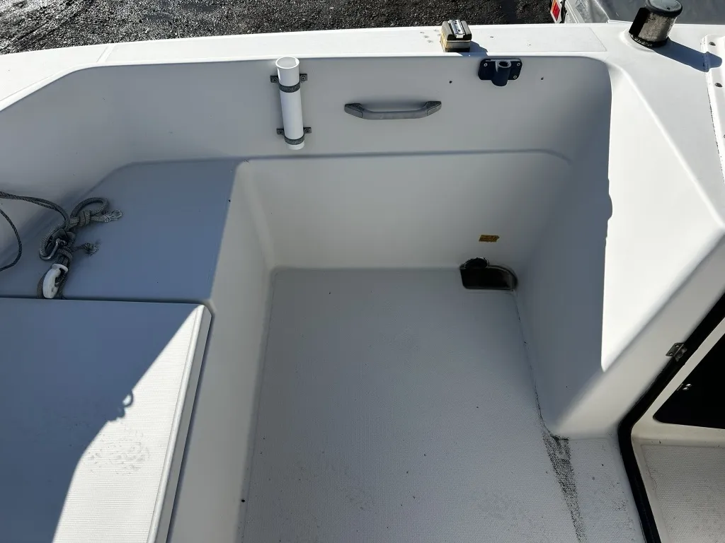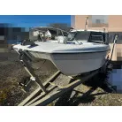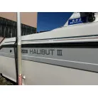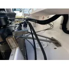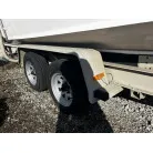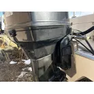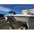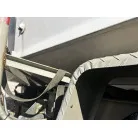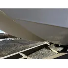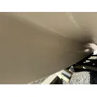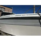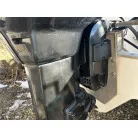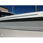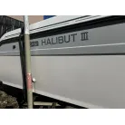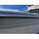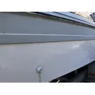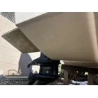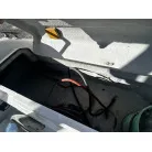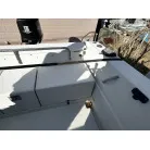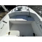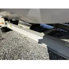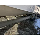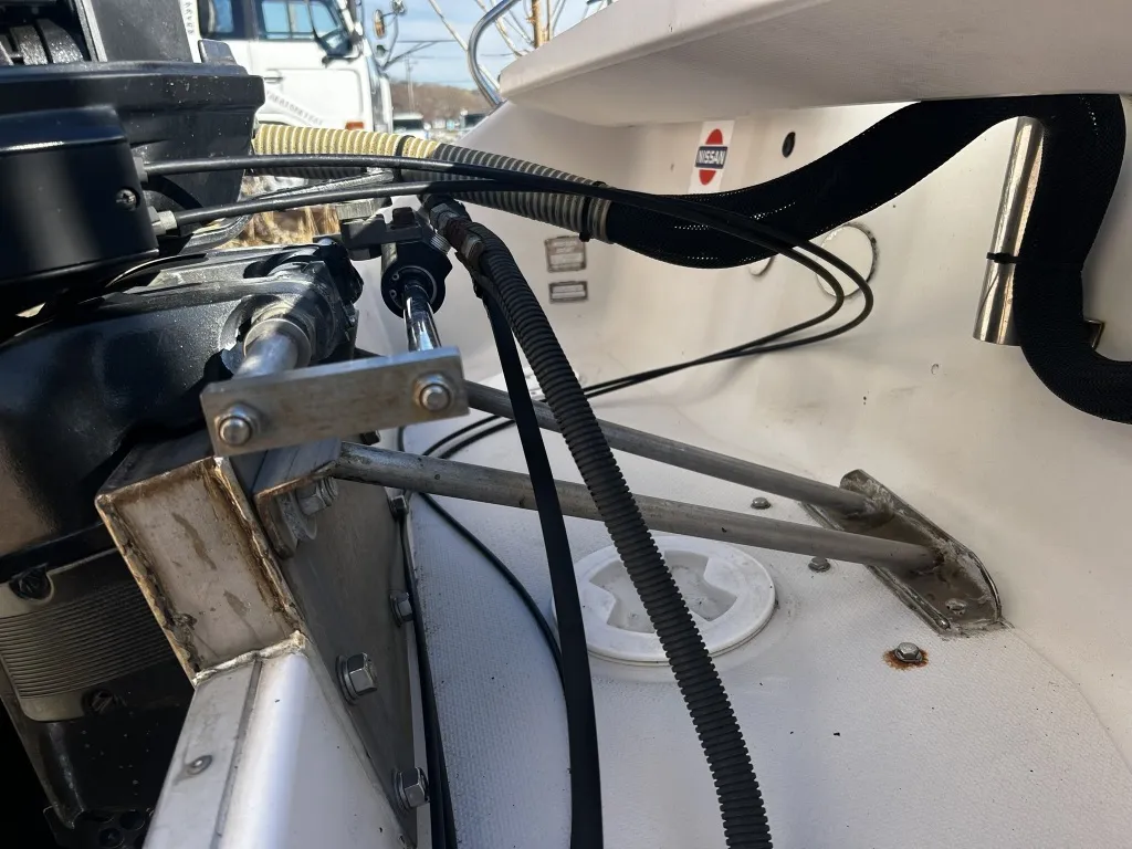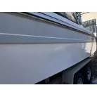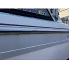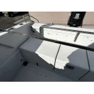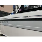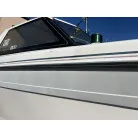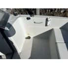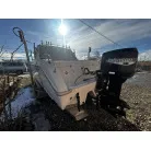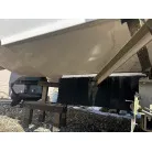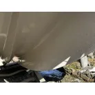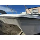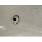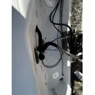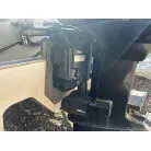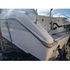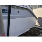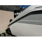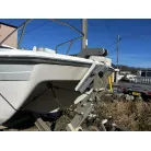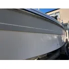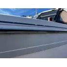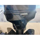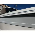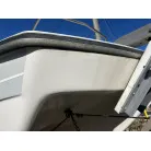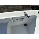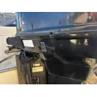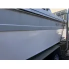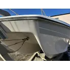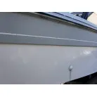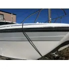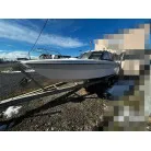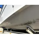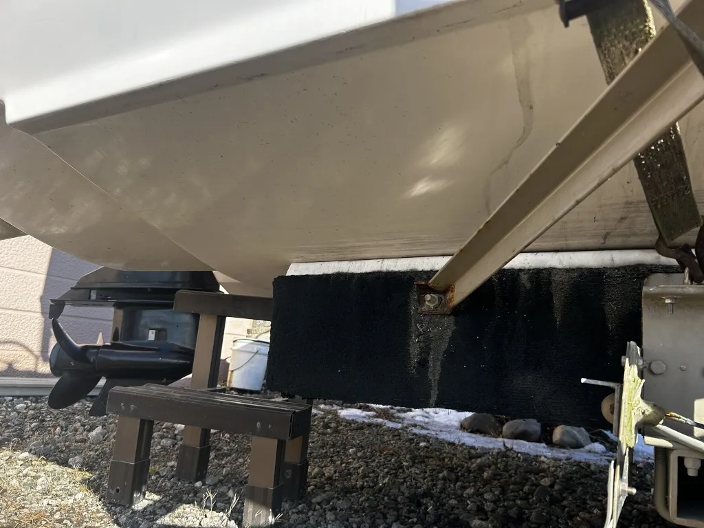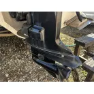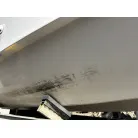 ハル回りの経過は、サイドのステッカーに一部剥がれや全体的に汚れがみられますが、クリーニングすれば比較的きれいな印象です。 左舷ガンネル付近には、FRP表面に一部欠けがあり、コーキングによる補修跡が確認できます。トランサムにはトリムタブが装備されており、走行時の姿勢制御に優れています。 大きな傷や損傷はなく、全体的に良好な状態を維持していると思われます。