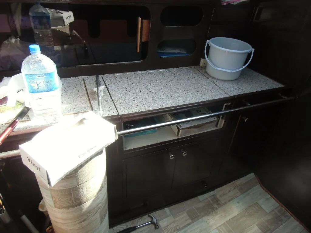 キャビンフロアーからステップを降りると、左舷にギャレー、正面にオーナールーム、右舷側はトイレルームになっています。