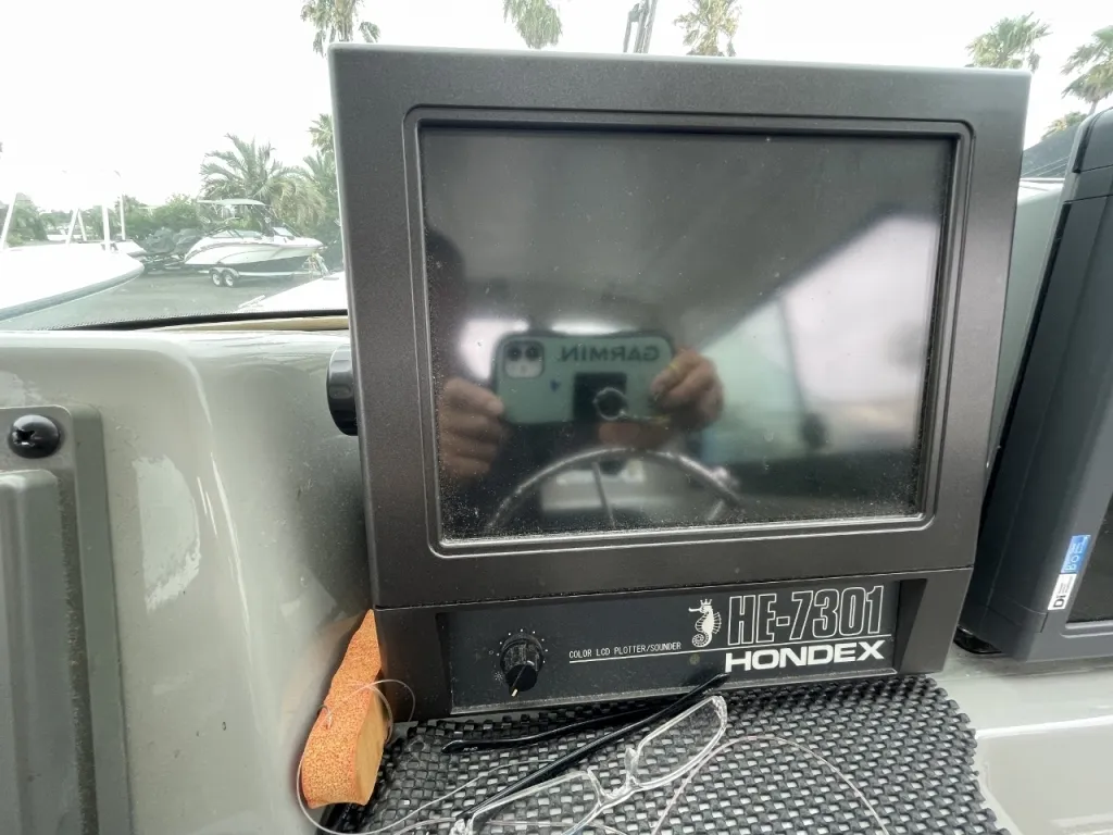 コンソールにHONDEX GPS・魚探が有ります、こちらのGPS・魚探の振動子は深場釣り用に5KWを取り付けているそうです。