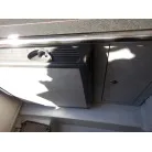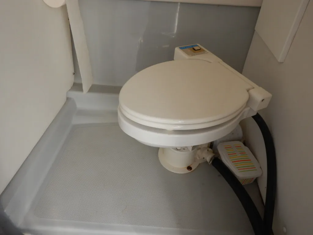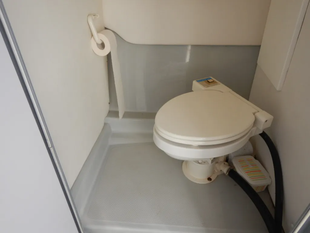 左舷側には小さなギャレーと冷蔵庫、TVがあります。