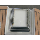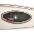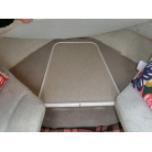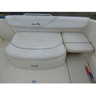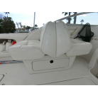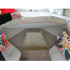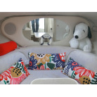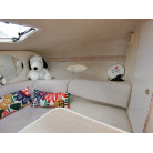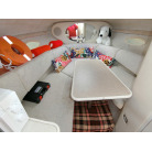 ・写真の状態ではシートには全体で大人5人程度座れます。左舷側の背中合わせのシートはフルフラットになり、トランサムドア前には付属の補助シートを置いて座席を増やすことが可能です。