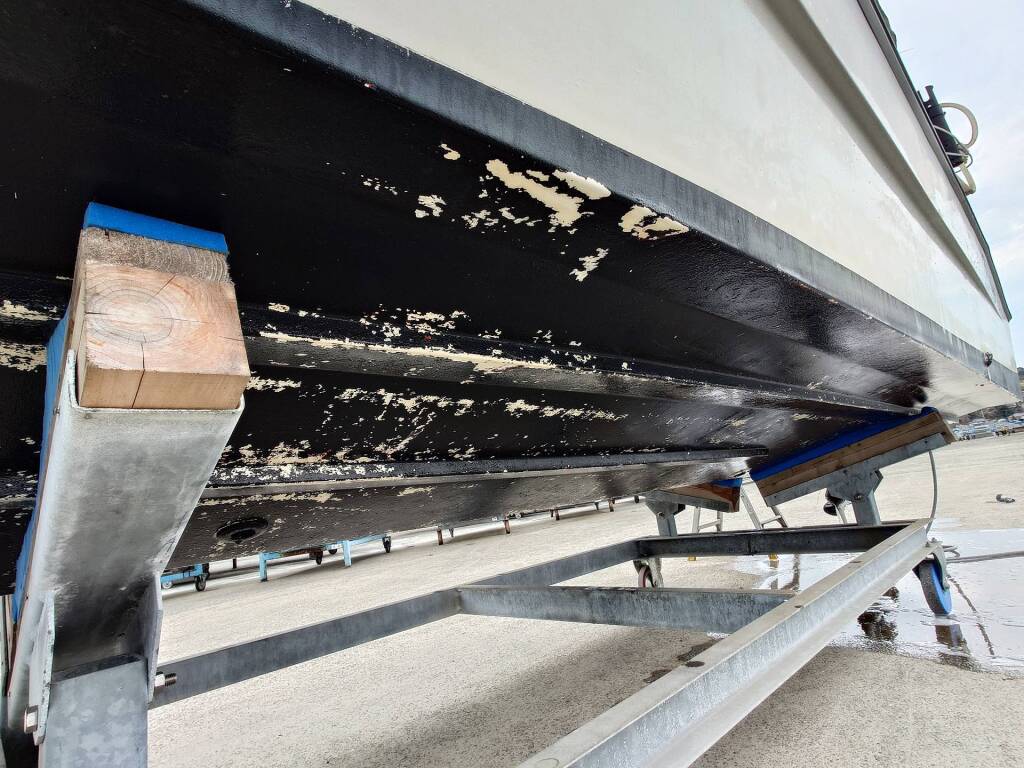 現在は陸上マリーナ保管ですが、その前は係留だったようで船底塗装歴があります。