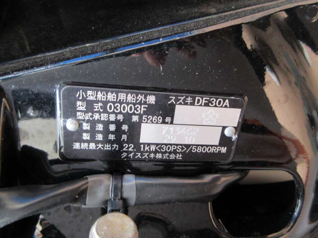 | 船検証記載馬力 | 30馬力 / 5,800rpm(回転数) | 推進機器種類 | 船外機 |