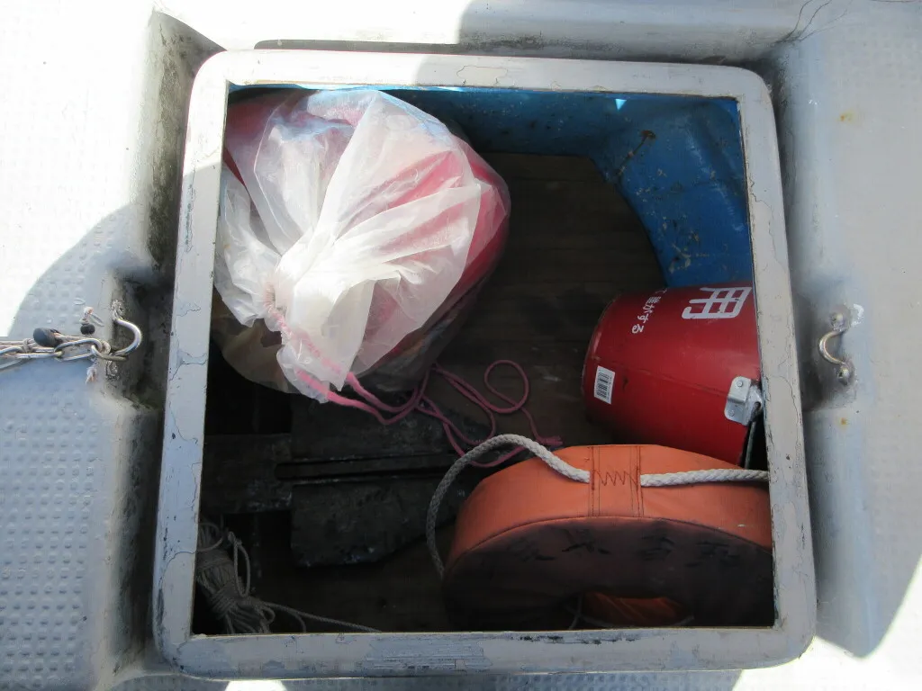 前部デッキには収納庫2カ所、イケス2カ所がありますが、全て収納庫として使用されております。。