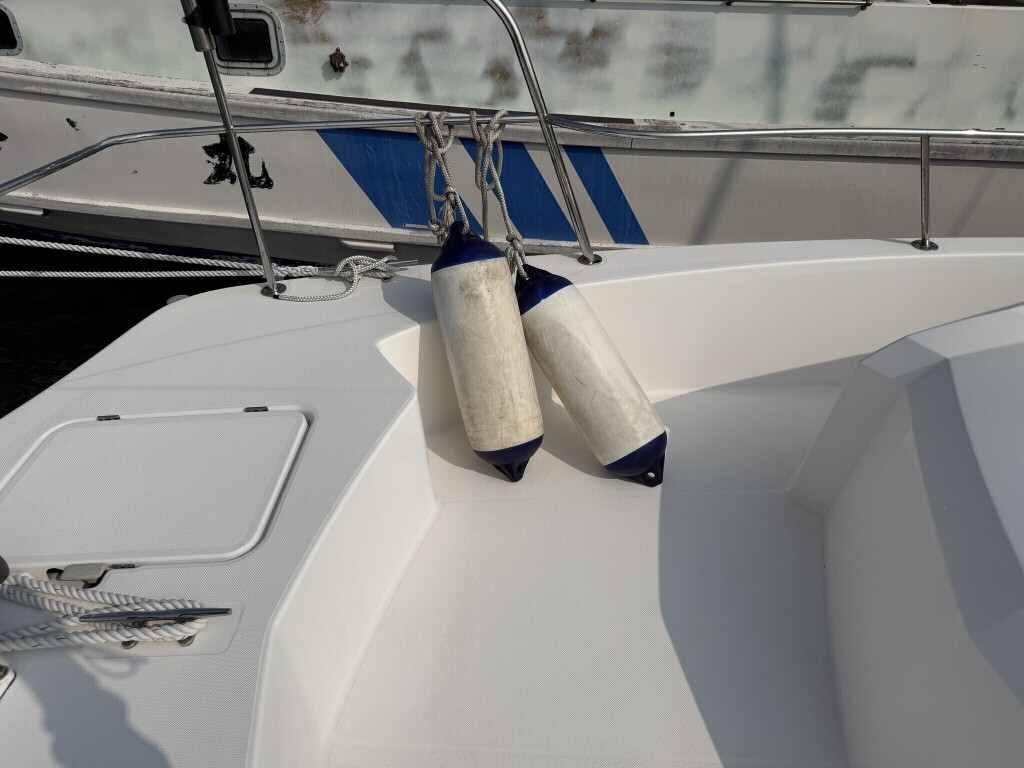 ウォークアラウンドタイプのこの艇は、ワイドなスクエアバウとトランサムデッキ、広いサイドウォークが備えられているため大人数でも釣りを楽しめそうです。