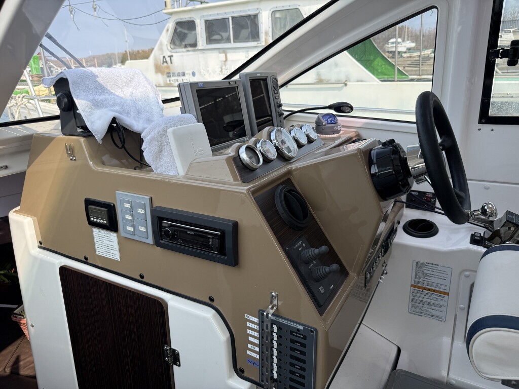 操船席周りの各種計器類は、GPS魚探、レーダー、ソナー、オートパイロットなど多数の装備が備えられています。