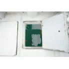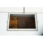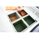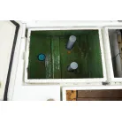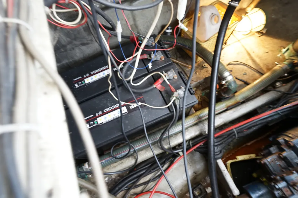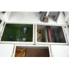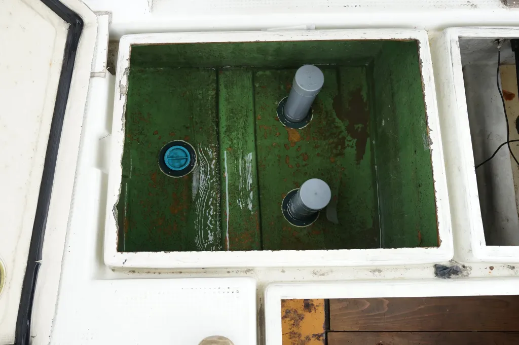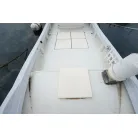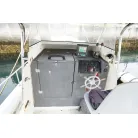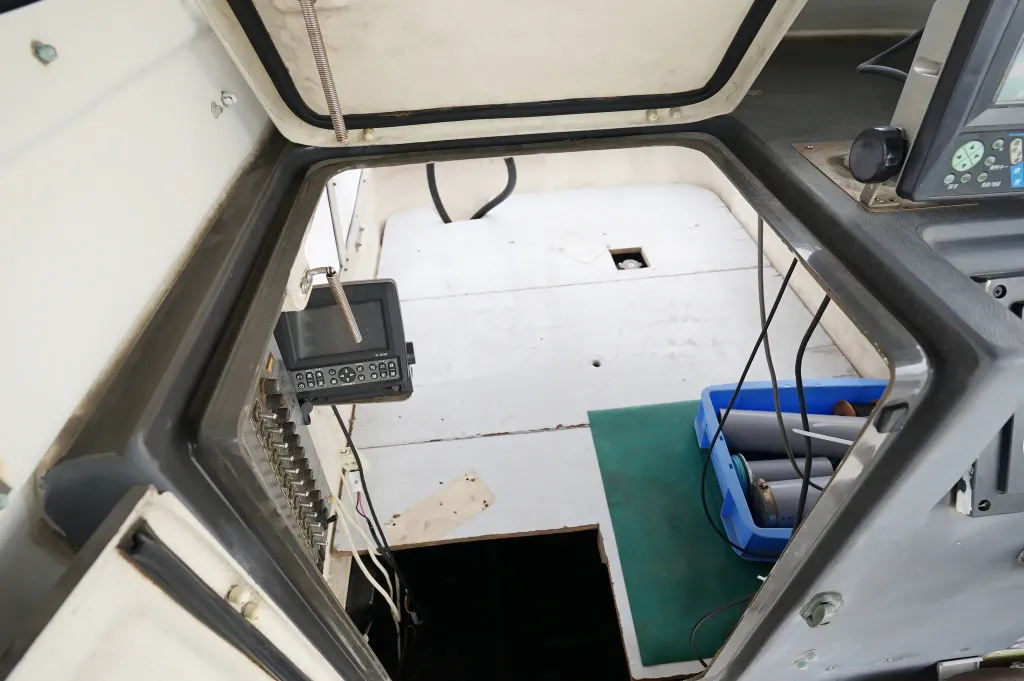 操舵席左側のハッチを開けると室内スペース。釣り道具や手荷物を置くぐらいの収納スペースです。床下の板を外すとエンジンルームです。右側のスイッチパネル横の小型の魚探は動作していません。