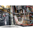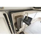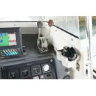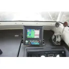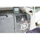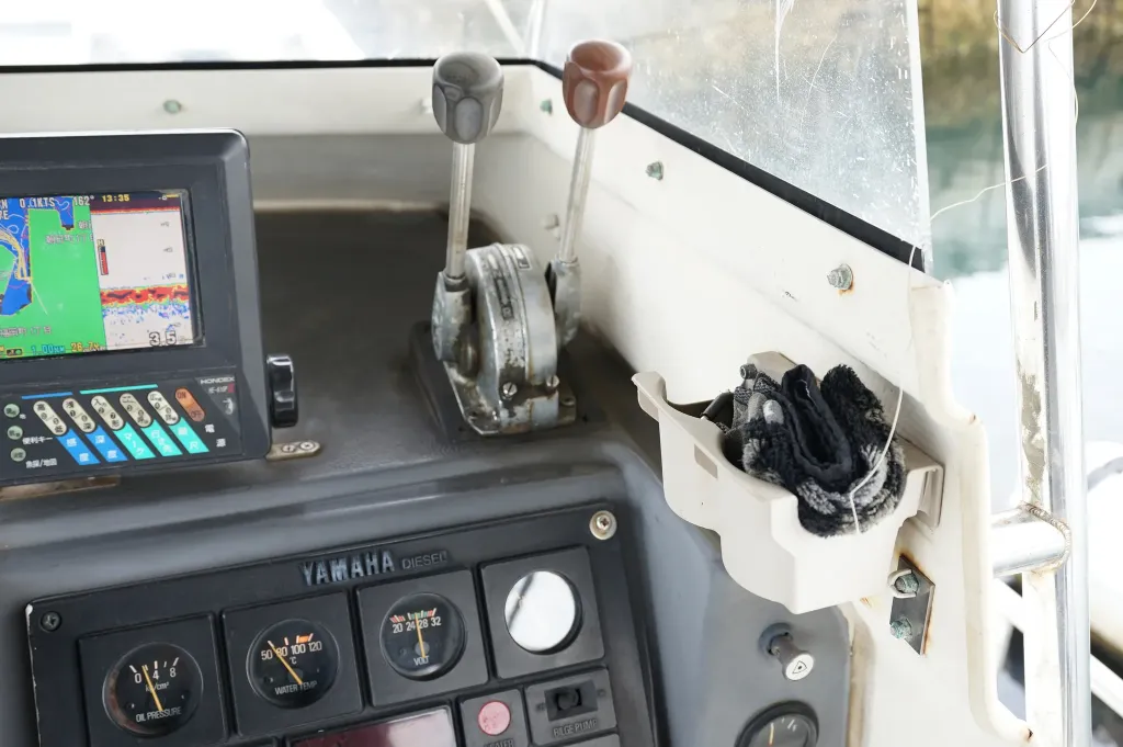 操舵席はシンプルに純正メーター類とGPS魚探のみ。計器類は全て正常に動作していました。操舵席の右側後方に2ステーションが設置されています。アワメーターは4487時間でした。GPS魚探はホンデックスHE-61GPIII 。
